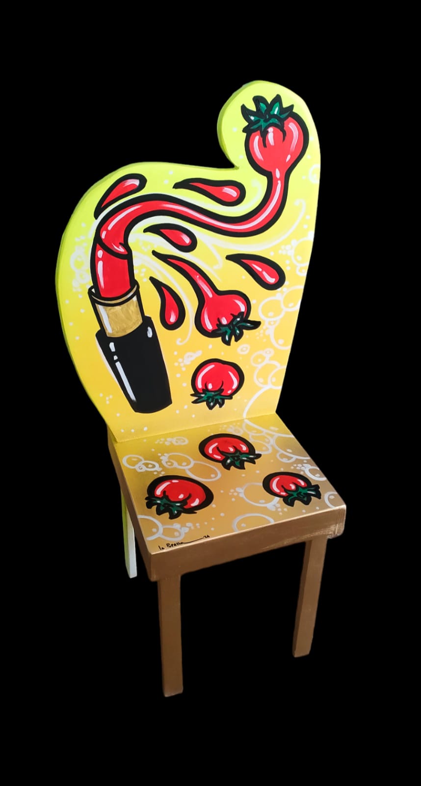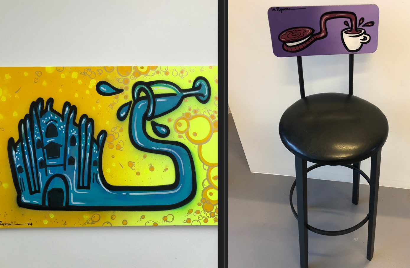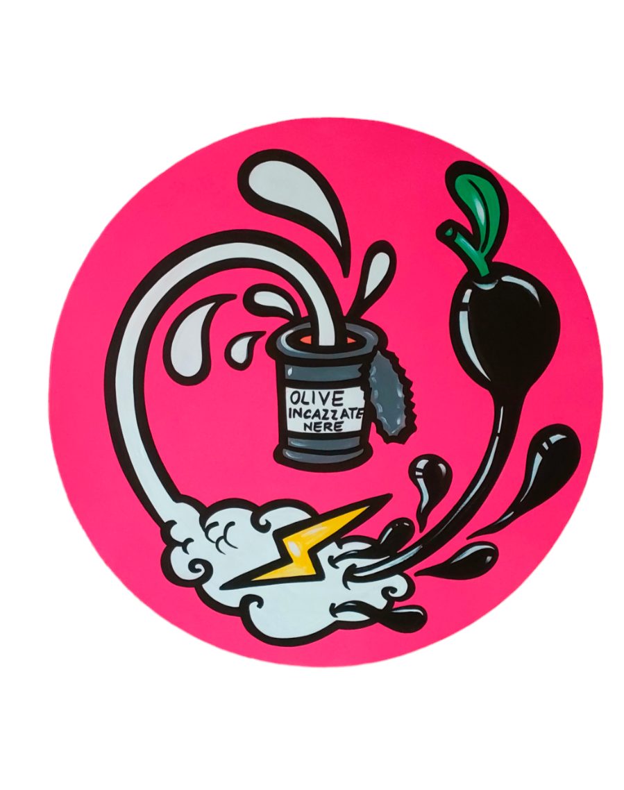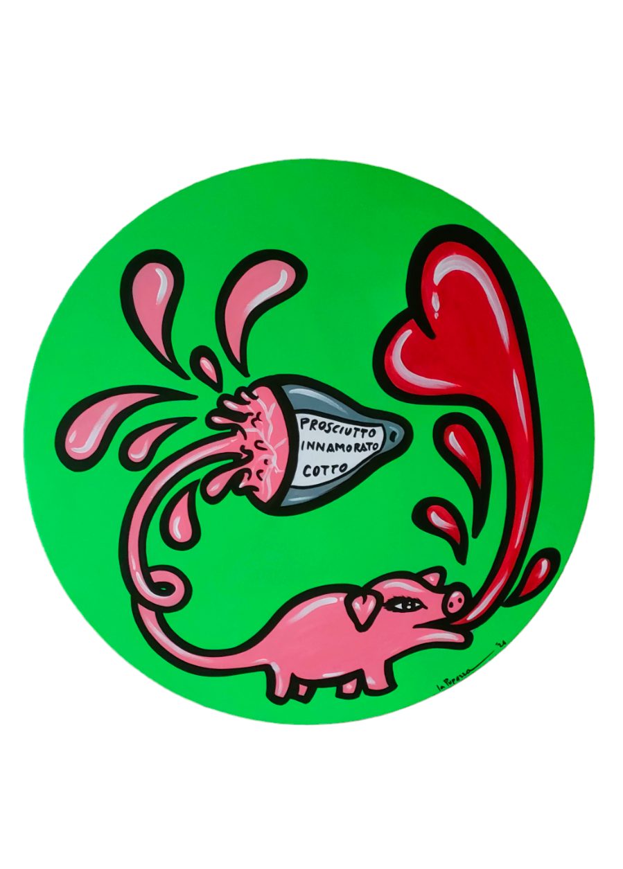“La mia arte è Pop, anzi Pup!” sintetizza con ironia. E l’ironia è centrale nel mondo de la Pupazza, basta leggere i titoli delle opere: Asciutta pasta, Olive incazzate nere, Prosciutto innamorato cotto. E ancora, il frigo dipinto dall’artista diventa Io me ne frigo e il letto con su dipinto un angelo diventa l’Angio-letto.