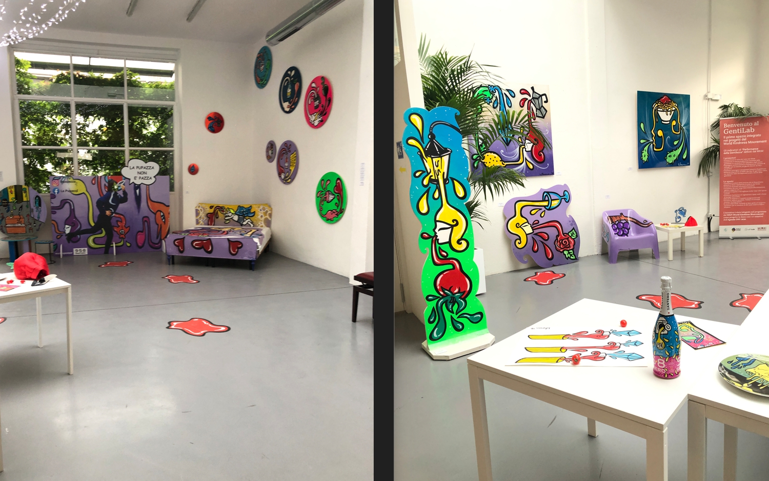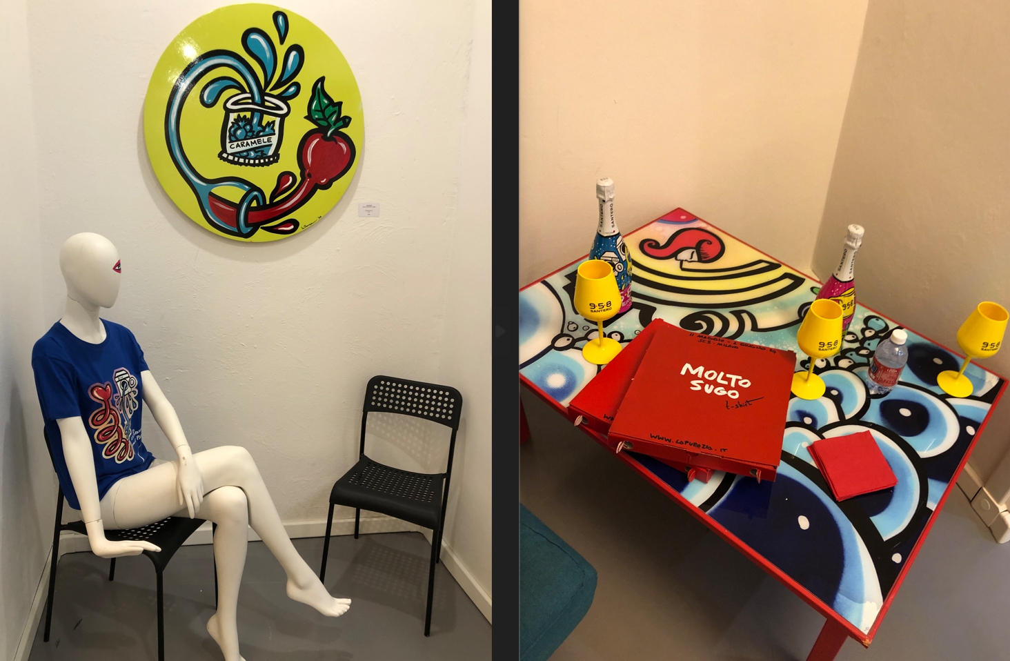 In mostra ci sono i lavori della pittrice realizzati ad acrilico e bomboletta su tavola e carta, gli oggetti di design e arredo personalizzati, l’inedito shop con oggettistica e abbigliamento, tutto brandizzato la Pupazza. Che, ricordiamolo, è un’artista che a Milano negli anni si è fatta conoscere per l’abbellimento delle energy box, quelle scatole che sono disseminate per strada che custodiscono contatori elettrici. Di solito colorate in grigio, a lei è venuto in mente di farci arte colorata sopra.