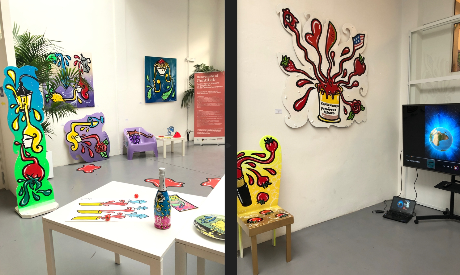 Il protagonista della mostra su più livelli e allestita come se fosse una casa, è il sugo di pomodoro, soggetto presente non solo nelle opere pittoriche e negli oggetti di arredo e design, ma anche nell’intrattenimento e nell’allestimento. Bottiglie di sugo con etichetta “Molto Sugo” e finte pozzanghere di salsa di pomodoro sul pavimento sono solo alcune delle invenzioni de la Pupazza, artista eclettica, visionaria, decisamente vulcanica. Le sue mostre sono note per essere coinvolgenti, riflesso di un’anima giocosa, che ama divertirsi e divertire il pubblico: infatti, il visitatore sarà coinvolto in prima persona nelle installazioni studiate ad hoc per l’evento.