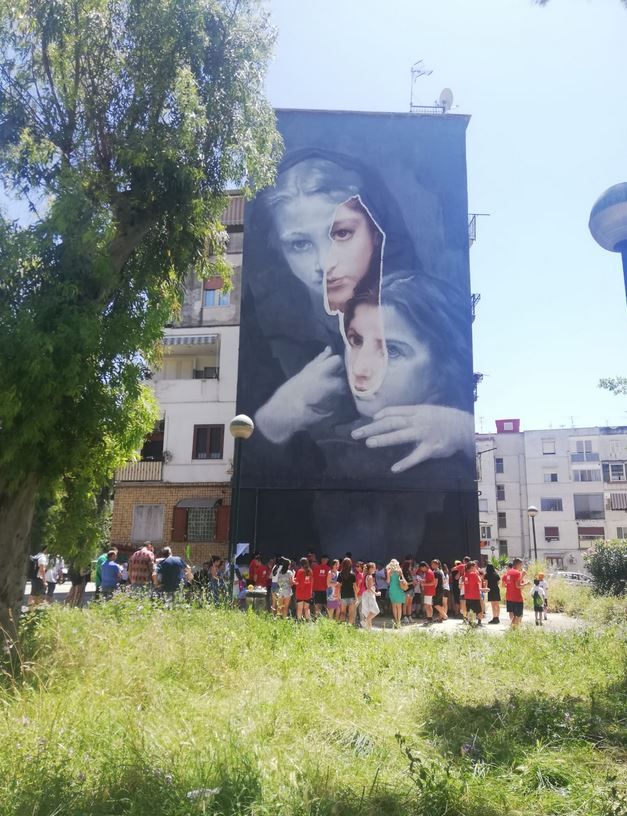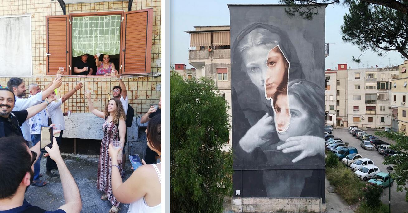 L’opera di street art si trova al Rione Luzzatti-Ascarelli, quartiere popolare della periferia orientale di Napoli, recentemente alla ribalta per le note vicende del best seller “L’Amica Geniale”. Partito all’inizio del 2018 con la campagna “I Colori del Rione” di Anema&Coop, il progetto ha visto la vivace partecipazione dei residenti, coinvolgendo in particolare la classe III E dell’Istituto comprensivo “Ruggiero-Bonghi”.