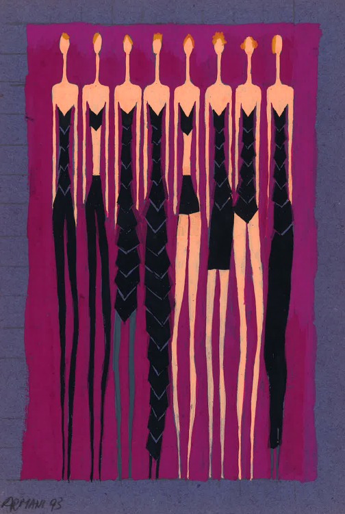 Flavio Lucchini non solo è stato il primo che ne ha intuito il valore agli inizi della sua carriera e l’ha lanciato sulle sue prestigiose testate (Vogue, L’Uomo Vogue, Donna, Mondo Uomo) ma ne è stato direttamente influenzato quando ha scelto di lasciare l’editoria per l’arte. Molte delle sue opere raccontano infatti la moda degli anni 80/90 ispirandosi, nei tratti, nelle forme, nei colori, alle linee rigorose della sua moda che mentre “scioglieva” le rigidezze dell’abito maschile, regalava una nuova sicurezza alla donna “in carriera” senza sminuirne la femminilità. Giacche dalle spalle decise, toni neutri, il famoso greige, scollature dal disegno netto e audace, disegnavano il nuovo stile italiano dopo l’ubriacatura degli eccessi dei primi anni 80.