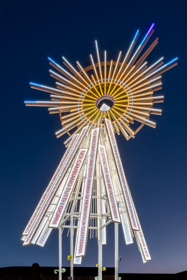 Come afferma Marinella Senatore, “Io Contengo Moltitudini è un’istallazione luminosa creata in collaborazione con la comunità di Rebibbia. Nella sua forma, si presenta come una struttura verticale che evoca le macchine usate nei fuochi d’artificio delle festività barocche romane. Nella mia pratica le opere sono innanzitutto esperienze condivise e trasformative, riflesso del mio impegno continuo nella partecipazione attiva e nella collaborazione collettiva. Le frasi selezionate, raccolte insieme ai membri della comunità, sono espressioni potenti di speranza e si intrecciano in una narrazione comune attraverso cui l’opera diventa un luogo di incontro e condivisione. Le luminarie, ispirate alle tradizioni popolari del Sud Italia e realizzate in collaborazione con artigiani locali, diventano architetture effimere che creano occasioni di incontro e partecipazione. La luce ha la capacità di trasformare un luogo in uno spazio speciale dove possano accadere cose speciali.”