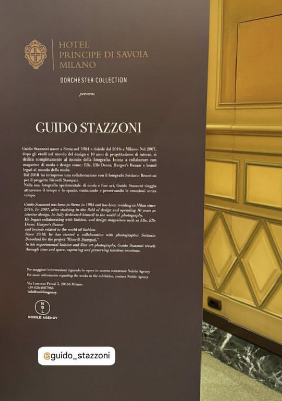 Fotografo ritrattista, Guido Stazzoni, dopo aver dedicato anni al design d’interni ha ora un’occhio unico per la luce, lo spazio e i dettagli scultorei. Un’eleganza raffinata contraddistingue ogni suo scatto. La mostra è allestita nell’elegante salotto del centralissimo hotel milanese ed è curata da Nobile Agency, agenzia di produzione, eventi e contenuti culturali che coltivano l’incrocio fra arte cultura e fotografia. La nostra sarà visibile da oggi per tutto il mese di settembre 2024.