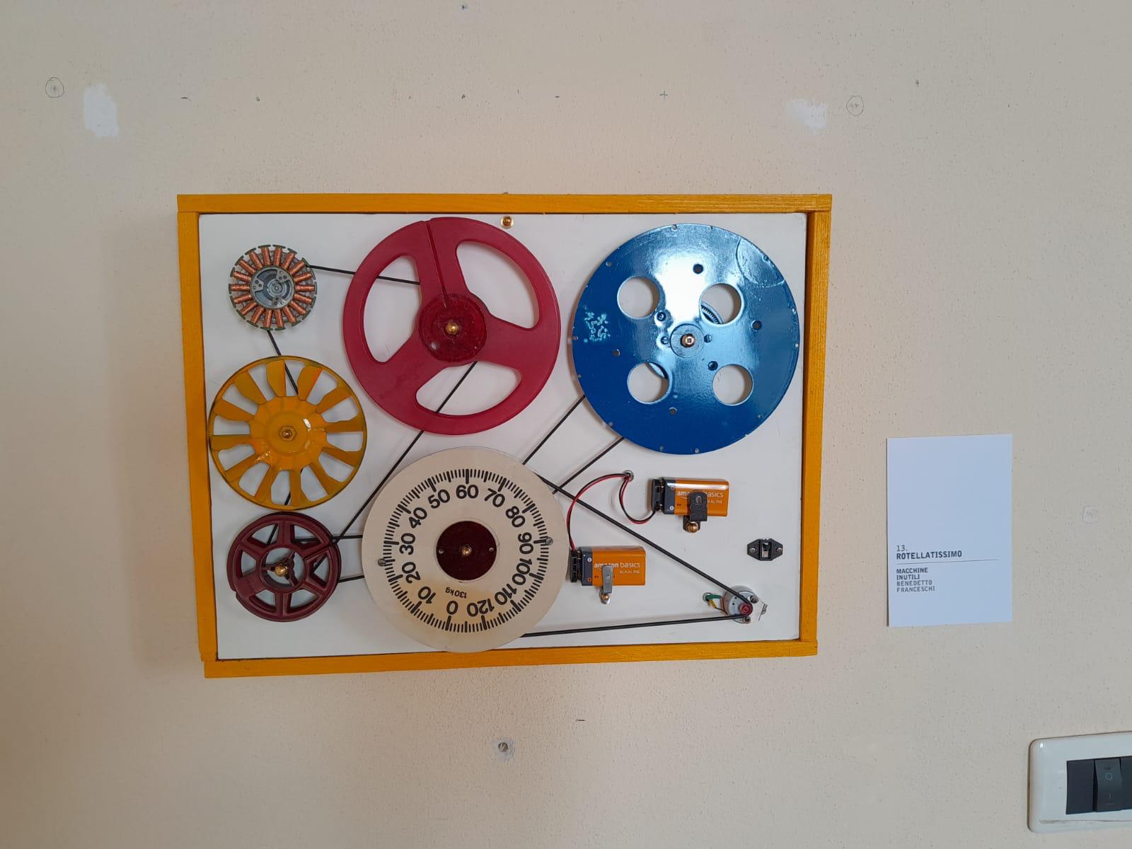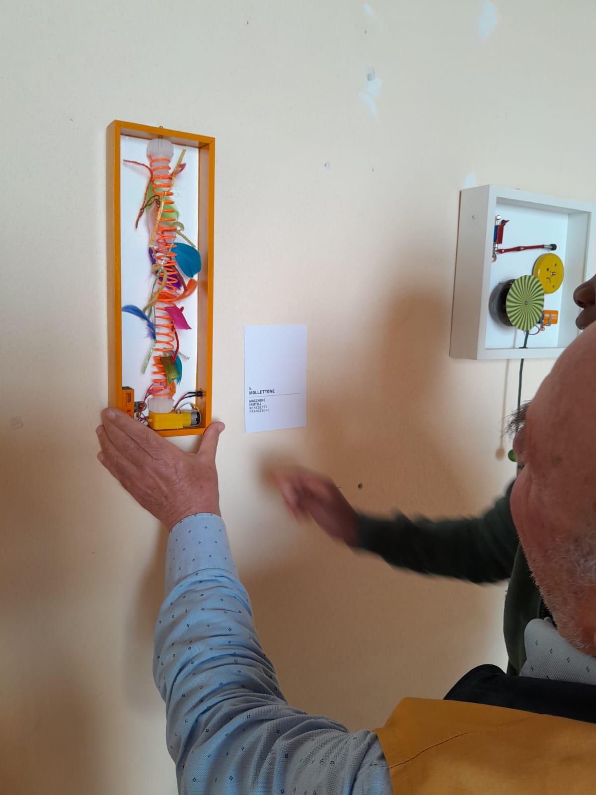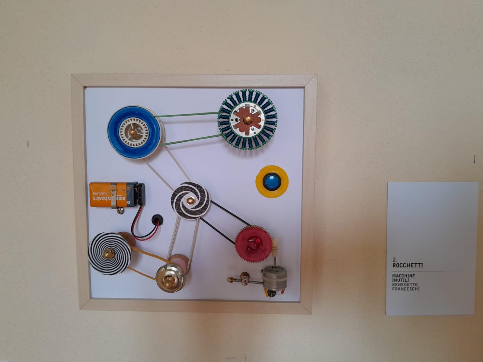Le “macchine” di Franceschi non sono state realizzate per produrre, correggere, velocizzare o ottimizzare, tuttavia invitano a riflettere. Traggono la loro genesi da oggetti della quotidianità. Talora sono pezzi piccoli o più grandi, quali relitti della società consumistica, spesso rotti, dimenticati, scartati che Benedetto ha raccolto nel tempo con la pazienza di chi sa che qualcosa tornerà utile. Interruttori, campanelli, bulloni, eliche, piume e nastri, pezzi di strumenti scientifici che ritrovano una vita rinnovata, rimontati secondo la genialità dell’artista. Nessuno fine ultimo preciso; solo quel senso della meccanicità del movimento, del dinamismo che sottende alle sue creazioni. “Nato a Pozzuoli nel 1940, Benedetto Franceschi ha iniziato fin da bambino a smontare ciò che non funzionava. Invece di aggiustarlo, lo ha ricomposto a modo suo. Da questa attitudine nasce un percorso che lo ha portato a costruire oltre cento “macchine inutili”, oggi presenti in collezioni private in Italia e all’estero, e già esposte in sedi come il Palazzo dello Spagnolo di Napoli, la Galleria NINA, la Pinacoteca Provinciale di Salerno e lo Studio Orma di Roma. La sua pratica richiama gli esperimenti ironici e ingegnosi di Bruno Munari e dialoga idealmente con le sculture cinetiche di Jean Tinguely, ma se ne distacca per un approccio più artigianale, essenziale e profondamente personale. Franceschi ha dedicato la sua ricerca alla trasformazione di materiali tecnici in forme poetiche, seguendo un’intuizione infantile rimasta intatta nel tempo: che ogni oggetto rotto contenga già un’altra possibilità”.