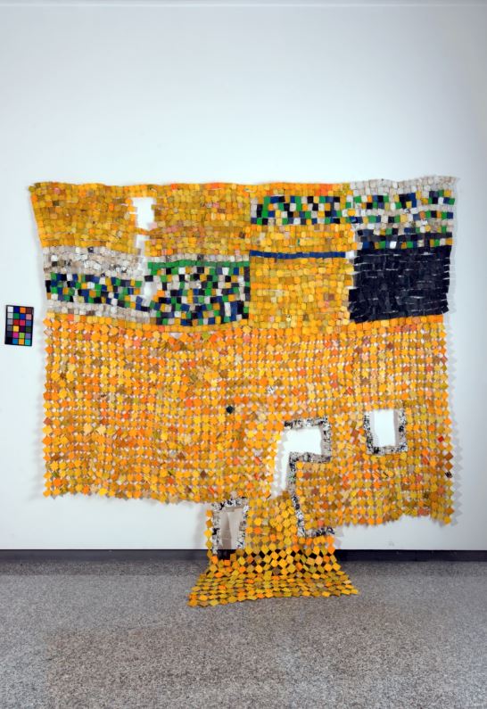 Centrale nel lavoro di Clottey è il dialogo con la storia culturale e politica del suo paese, il Ghana. Le opere esposte, enormi tappeti, costituiti da tessere di plastica gialla unite fra loro da fili di rame, sono realizzate utilizzando le taniche gialle che l’artista, insieme al suo collettivo, ha raccolto per le strade e le spiagge di Accra. Questi contenitori, i gallons, furono portate dall’Europa durante l’era coloniale e costituiscono un immenso problema ecologico in Ghana, dove esistono poche iniziative per lo smaltimento e il riciclaggio. Conosciuti come gallons ‘Kufuor’ – da John Kufuor, il secondo presidente della Quarta Repubblica del Ghana – queste taniche sono storicamente legate a gravi carenze idriche ad Accra.