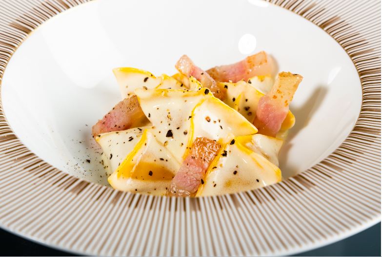 A parte, si prepara e si versa su un piatto una fonduta di crème fraîche sciolta e pecorino grattato, sopra cui vi si adagiano i ravioli e il guanciale rosolato.