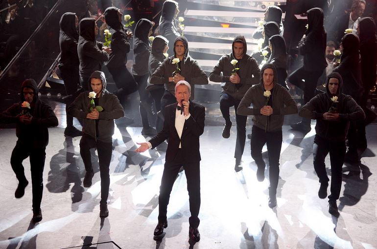 Si è parlato del ritorno alla danza dopo anni (se non decenni) al Festival di Sanremo e così è stato. Baglioni è entrato in scena su un trampolino, cantando un vecchio brano dal disco più ermetico del suo repertorio (Oltre del 1990) che si chiama “Noi No”. Il tour “Al Centro” prosegue anche nel 2019 e i ballerini con le rose bianche lo hanno accompagnato anche in questo assaggio del suo concerto.