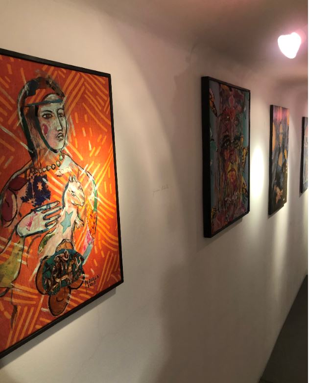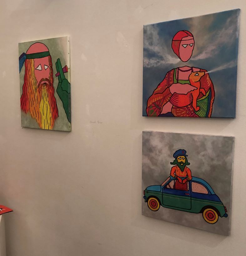 Leonardo Santoli (di cui vedete un particolare in foto d’apertura) dice di essere alla ricerca di “segni, simboli mitici e forme che vanno dai giochi elettronici alla pittura tradizionale”. Federico Cozzucoli, in pausa di riflessione in questo momento, rivisita in chiave moderna il pensiero ecclesiastico con una manifestazione artistica consona a questa via.