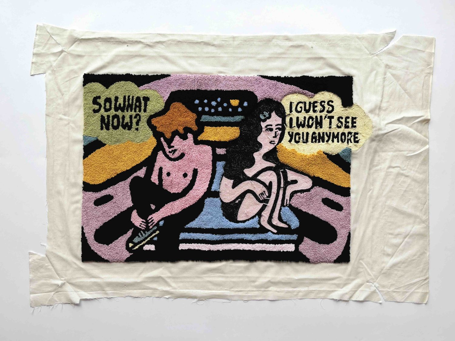 In mostra per la prima volta un nuovo corpus di opere tessili e installative concepite e realizzate da Armadilly, all’anagrafe Camilla Cesarini (classe 1995), con una ricerca artistica che fonde arte tessile, estetica pop e riferimenti al mondo digitale. Le sue opere si liberano dai vincoli tradizionali del telaio e della cornice, trasformandosi in vignette intrecciate con filati di lana e cotone, capaci di raccontare storie ironiche e profonde sulla società contemporanea. Attraverso colori accesi e forme iconiche, Armadilly esplora i meccanismi di autorappresentazione nei social media, il bisogno di validazione e le insicurezze dell’identità digitale. Il titolo della mostra, “Look at me, I am the sun!”, nasce da un episodio personale dell’artista: una lettura di carte che le assegnò il Sole, simbolo di luce e centralità, che lei reinterpretò ironicamente come un’autoaffermazione.