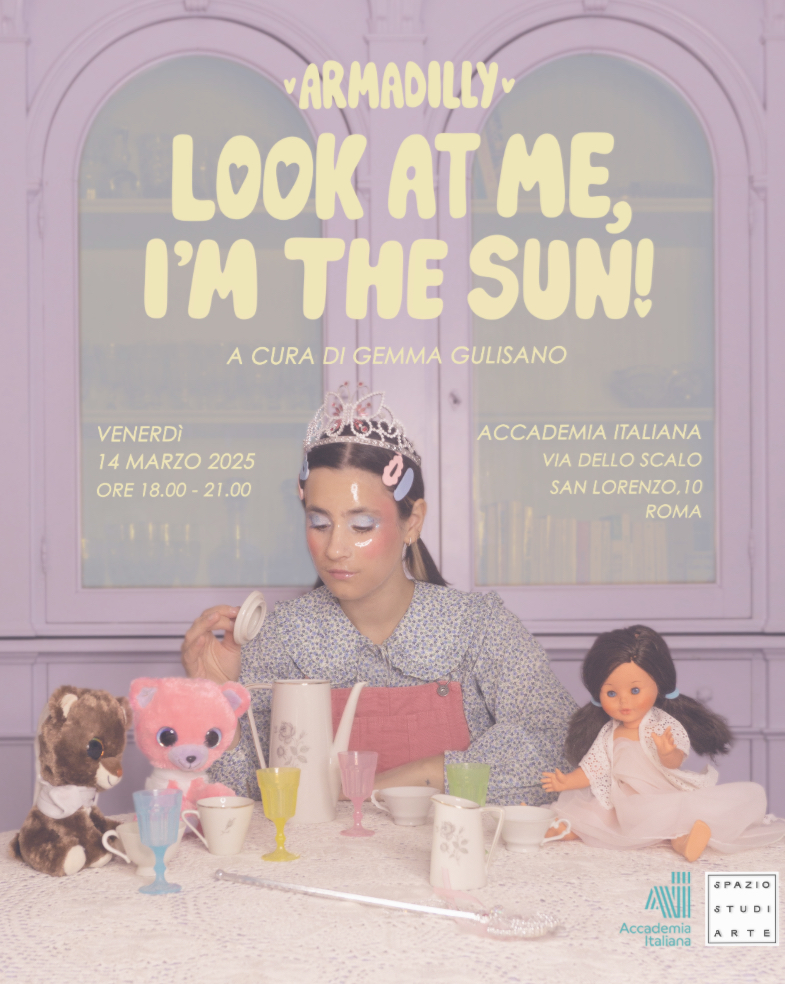 Accademia Italiana a Roma, in collaborazione con Spazio Studi Arte,inaugura la mostra personale di Armadilly, artista emergente nel panorama contemporaneo, dal titolo “Look at me, I am the sun!”, a cura di Gemma Gulisano. L’esposizione, che aprirà al pubblico dal 14 marzo all’11 aprile 2025 (ingresso gratuito), sarà ospitata negli spazi espositivi della sede di Roma dell’Accademia Italiana, via dello Scalo San Lorenzo 10, con vernissage il 14 marzo dalle ore 18:00 alle 21:00.