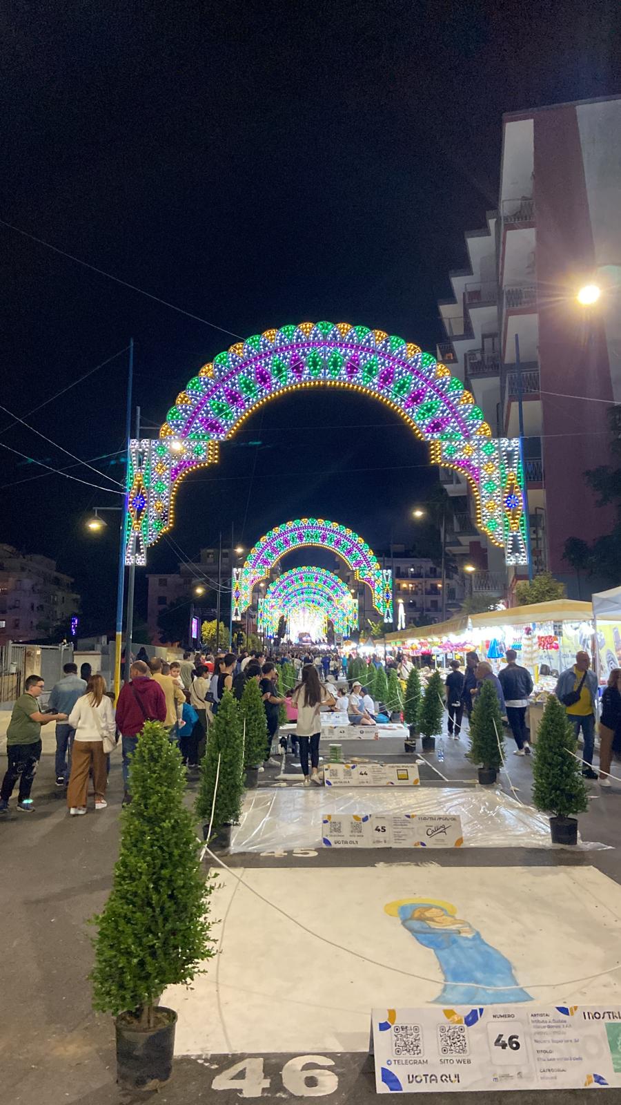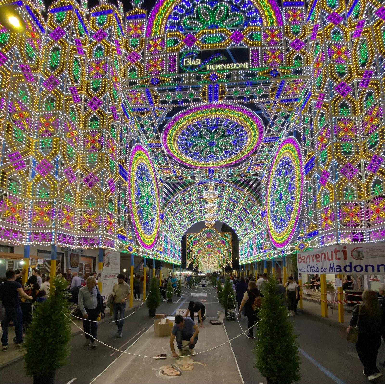 A stupirci, sono state superbe creazioni, volti tratti da un repertorio d’ascendenza classica e dalla fantasia di artisti e studenti che lavorano, piegati al suolo, con gessetti e terre colorate. All’imbrunire, i colori ora brillanti, ora monocromi, si sono accesi in un tripudio di luminarie che variano anch’esse, anno dopo anno. Rievocano i fasti barocchi d’una tradizione del Sud Italia che lascia senza fiato per l’imponenza dell’apparato scenografico delle luci colorate.