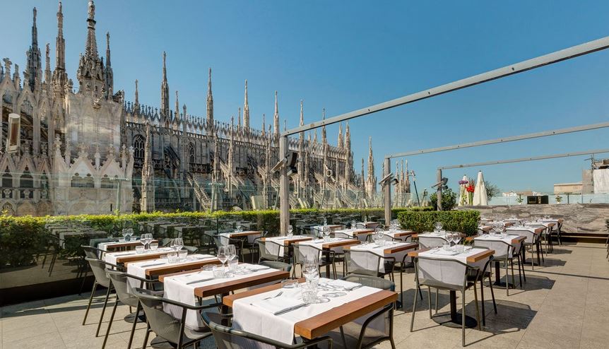 Oltre a dialogare con il Champagne Bar, interagisce con l’esclusiva terrazza con affaccio privilegiato sul Duomo di Milano in cui troviamo i separè in vetro e ferro illuminati e i marmi dalle venature accentuate.