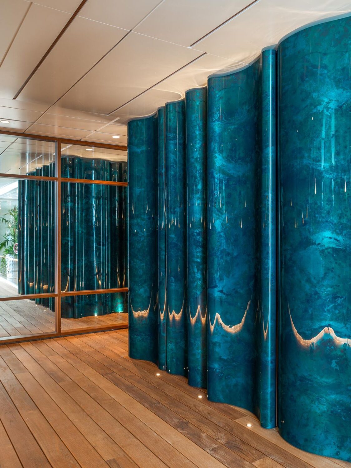L’area interna viene ripensata in ogni sua superficie e colore. Inserti e boiserie in acciaio e rame si abbinano alle tonalità marine delle pareti e alle pietre di rivestimento, dialogando con le forme morbide degli arredi che richiamano i movimenti fluidi del mare. Il risultato è una vera e propria esperienza di viaggio che accompagna gli ospiti dall’ingresso fino all’area spiaggia.