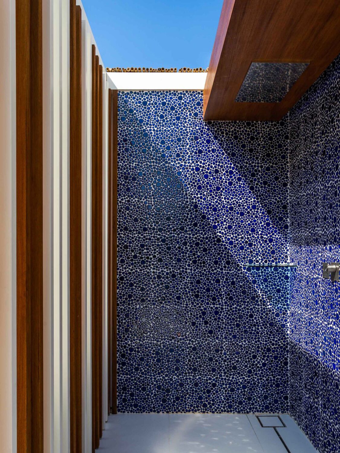Marmi, pietre, legni laccati e gres, tutti personalizzati con texture create appositamente dallo studio per questo progetto, si inseriscono in ogni ambiente e arredo. Isole lounge, lettini, focolari e superfici raccontano queste scelte materiche, offrendo un’esperienza di relax sofisticata a cielo aperto.
