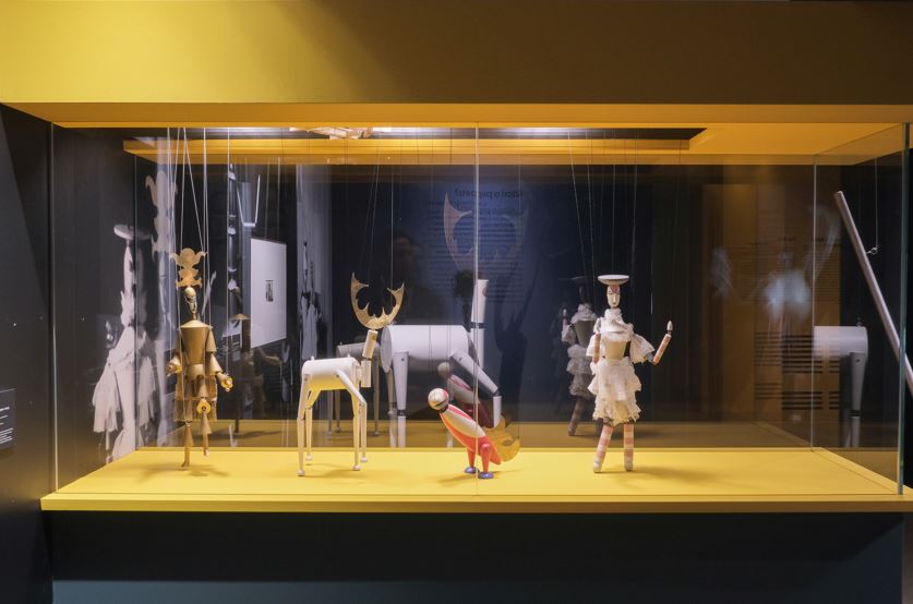Ad accogliere i visitatori a Palazzo Magnani di Reggio Emilia per la mostra “Marionette e avanguardia” ci sono i costumi a grandezza naturale disegnati da Pablo Picasso per Parade, balletto coreografico che i Ballets russes di Sergej Djaghilev portarono in scena a Parigi nel 1917.