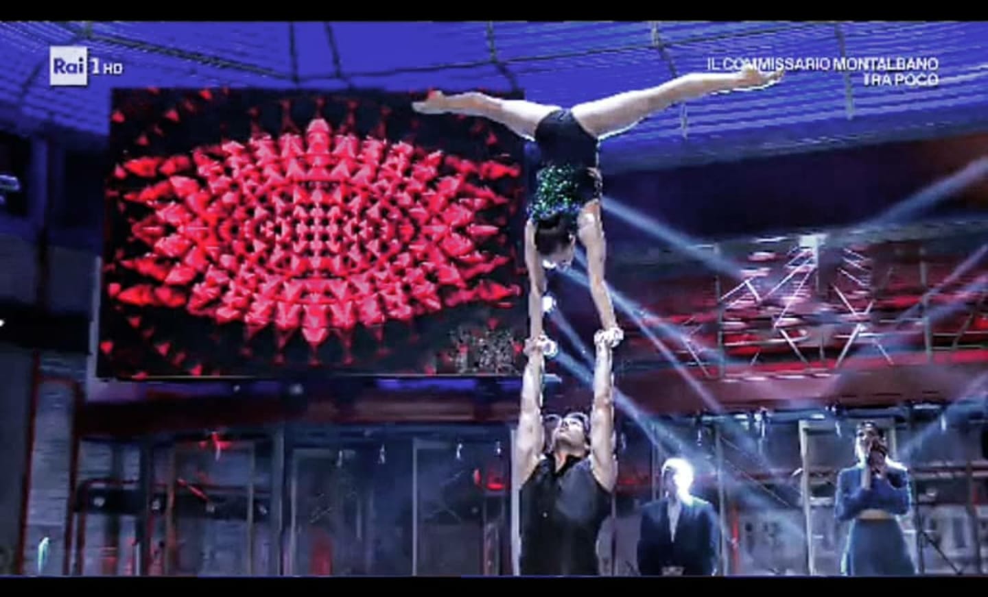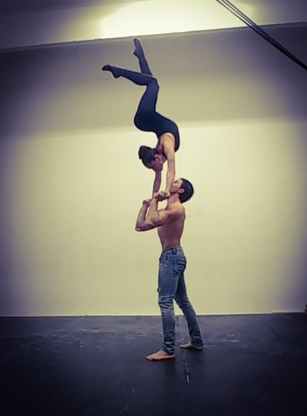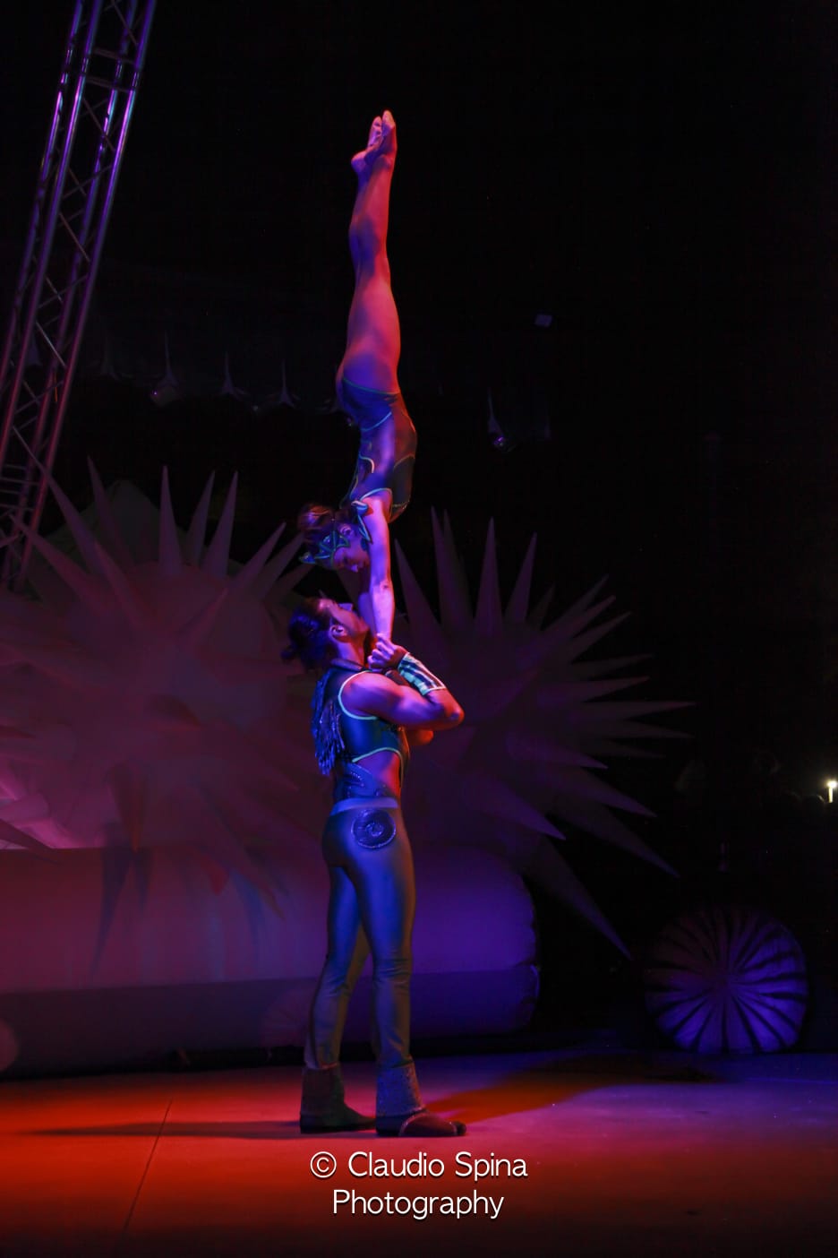 Giulia Serra, 27 anni ha avuto un passato in aerobica, e poi si è allenata con la nazionale di danza acrobatica. Lei è sarda e ha studiato all’Accademia Spid. La disciplina che portiamo nello spettacolo si chiama mano a mano. Avevo già iniziato a farla in accademia e dopo che ho consociuto lei e ho visto le sue capacità, le ho proposto di creare un numero. Adesso è solo un anno che lavoriamo e ci alleniamo assieme. Principalmente la disciplina si fonda sulla base che un corpo grosso e robusto sta sotto, mentre quello di sopra è agile e piccolo. Ma non sempre è così.
