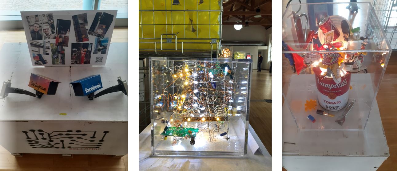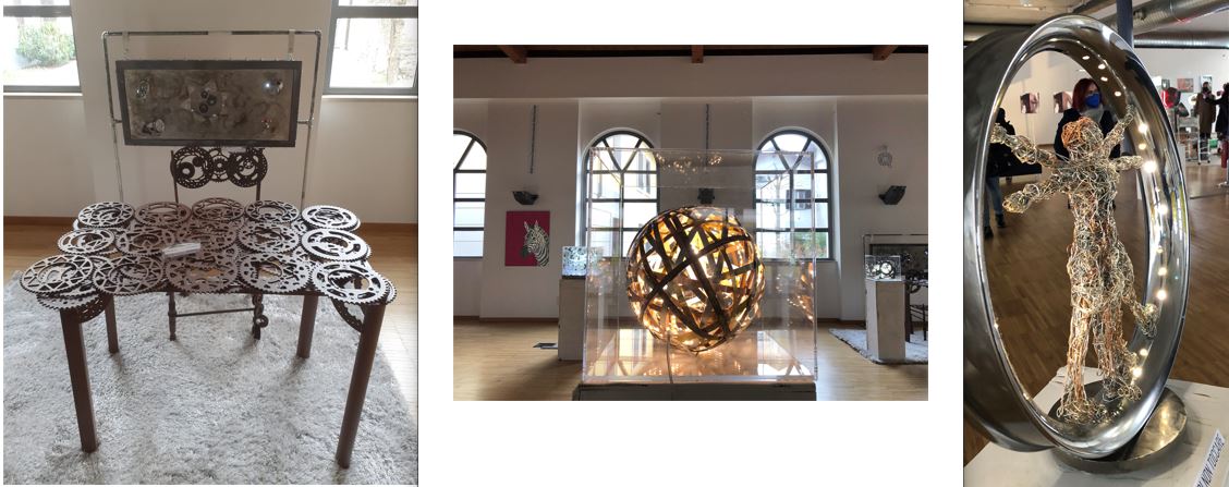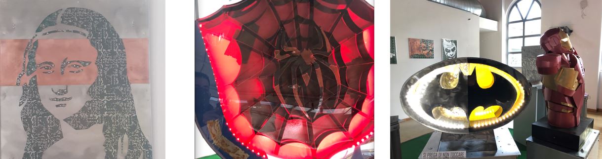 Meccanismi elettronici che componevano altre strutture riabilitati ad arte sono il cuore dell’esposizione che ha il patrocinio del comune di Seregno e la media partnership di The Way Magazine. Ma oltre a sculture luminose, super-eroi di metallo e quadri realizzati con scarti industriali, ci sono anche delle testimonianze di valenza sociale. Come in “Angel”, un mezzo-busto angelico realizzato in materiali riciclati che è servito a chiamare a un’azione collettiva i visitatori ed estimatori dell’artista dalla sua pagina Instagram. “Ho pensato alla sofferenza del distanziamento sociale in epoca di pandemia e mi è venuto in mente di creare un meccanismo di incontro a distanza. Ogni persona ha potuto scattare un selfie a mezzobusto e ritrovarsi in un’installazione d’arte che riprendeva il busto del mio angelo ricomposto con foto di persone comuni”.