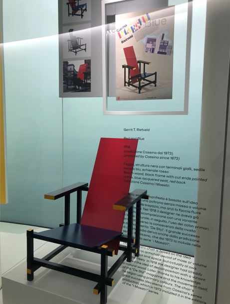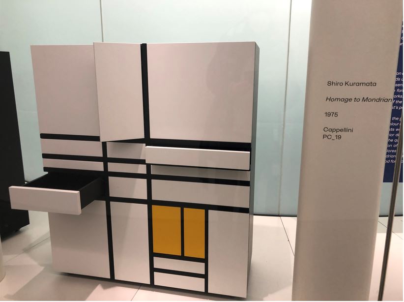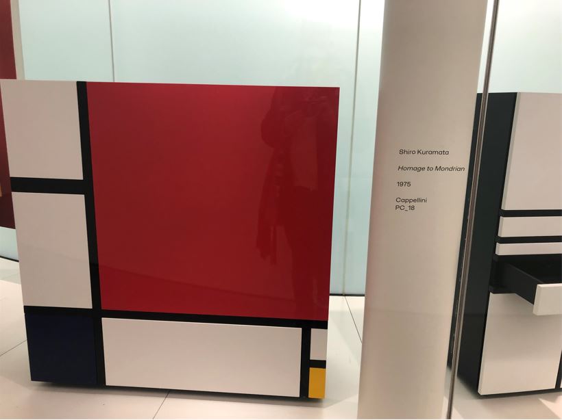 In mostra un affondo curato dalla storica del design Domitilla Dardi presenta tre risvolti dell’ ‘Effetto Mondrian’: la relazione tra De Stijl e Gerrit Rietveld, autore della poltrona Red and Blue, raccontata attraverso le riedizioni filologiche di Cassina, con i prototipi originali dei primi anni ’70 dai quali è poi scaturito il successo della celebre icona; la fortuna critica di Mondrian nella cultura artistica italiana, con i materiali che illustrano la prima personale del 1956 allestita da Carlo Scarpa alla GNAM di Roma, vero omaggio del maestro italiano al genio olandese; l’influenza del “pattern Mondrian” sugli autori contemporanei, come nel contenitore-tributo di Shiro Kuramata prodotto da Cappellini.
