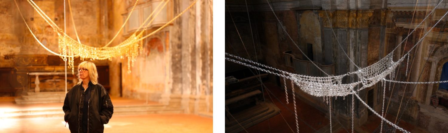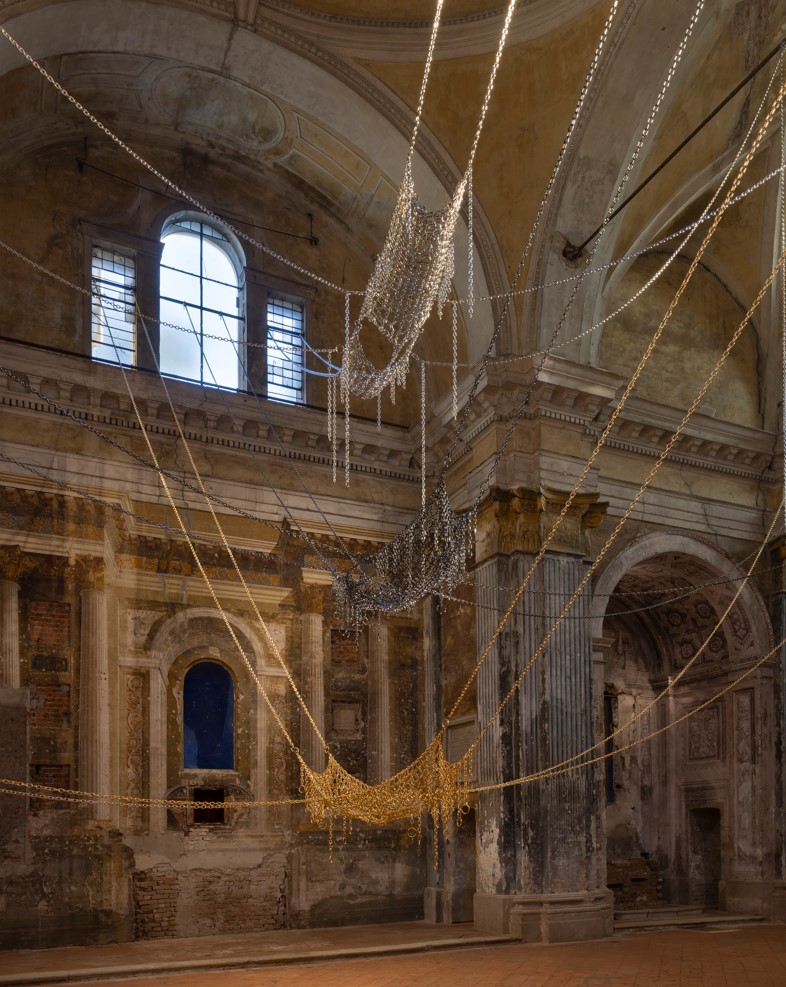 Monica Bonvicini, And Rose, veduta dell’installazione presso San Carlo Cremona, Cremona, Italia, 2024, anelli in acciaio zincato, maglie di catena e catene, 9×11 metri. Per gentile concessione dell’artista. ©Monica Bonvicini e VG Bild-Kunst/SIAE.