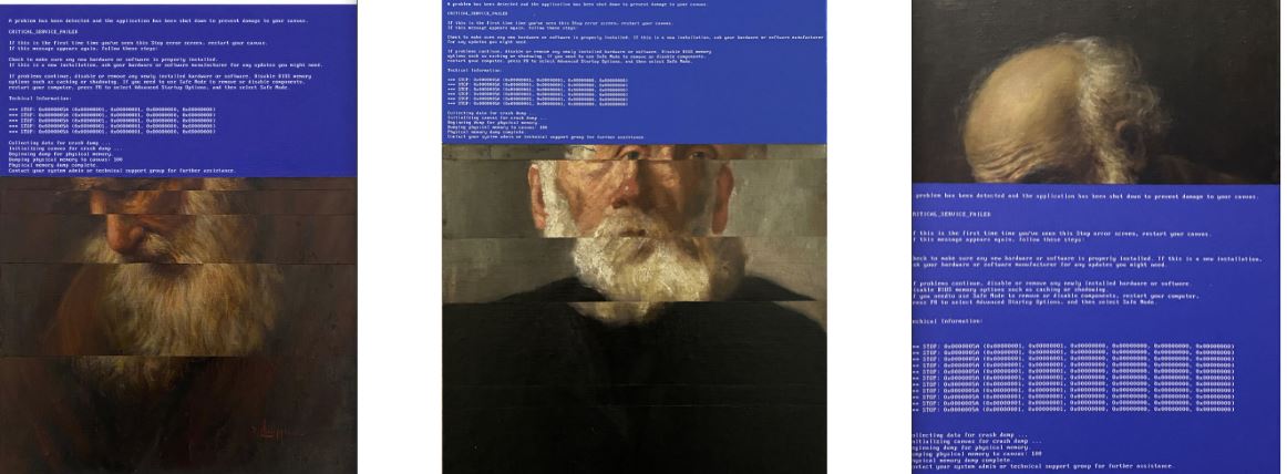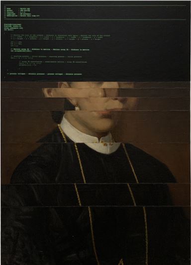 Nella serie più recente Silicio, il quadro ha una parte in cui l’opera originale è materialmente scomposta, come in fase di annullamento, e una parte in cui riporta i caratteri digitali del codice sorgente al cui interno sono inseriti gli algoritmi di distruzione dell’immagine. Quei codici non sono casuali, li ho scritti con due programmatori, sono proprio riferiti al percorso di fagocitamento dell’opera da parte della macchina. La tela subisce l’aggressione del digitale, inesorabile, mentre il dipinto si ostina a volersi far guardare dallo spettatore, nel tentativo di stabilire ancora quel contatto che si è perso.
