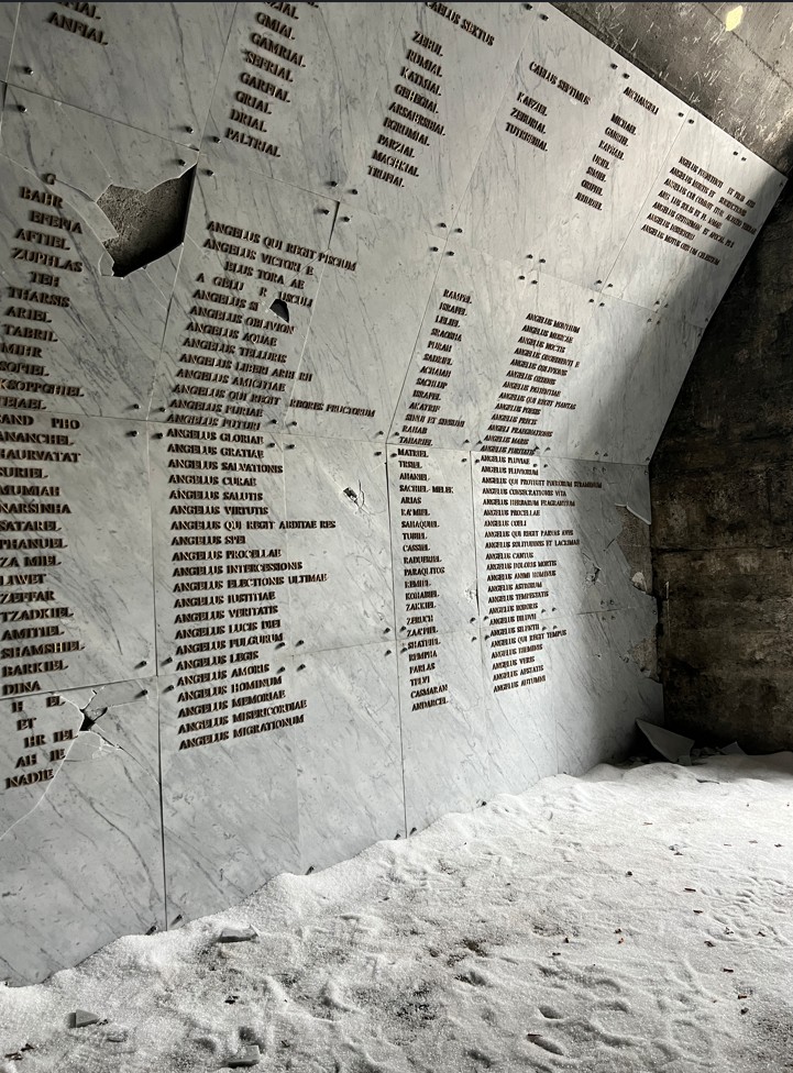 Paradiso è un’installazione concepita e progettata come una immagine distopica e lacerante di un cielo declinato in questo presente storico, in cui ogni prospettiva ideale sembra crollata. Una monumentale opera ambientale che si sviluppa su uno spazio di 3.000 metri quadrati, come un affondo diretto sulla realtà e sul tempo in cui viviamo. Agli occhi del visitatore si apre un paradiso svuotato, ridotto al proprio scheletro, devastato dal tempo o da qualcosa che lo ha lentamente consumato. Le sette volte celesti sono semi-crollate, infiltrate dall’umidità, dall’acqua, tappezzate di precari isolamenti. Le sette grandi aule dove risiedono le gerarchie angeliche sono vuote, abitate da clochard, avvolti nelle loro coperte termiche. Lungo il percorso, tra latrine sudicie e pozzanghere sciolte accanto a cumuli di neve, si insinua la sinistra sensazione che tutto ciò che vediamo sia il risultato di un atto di violenza. Una parete di marmo, su cui sono incisi tutti i nomi degli angeli, è in frantumi. Nell’ultima sala, dietro un grande portale di ferro un binario sotterraneo evoca una immagine indelebile nella memoria collettiva: la strada ferrata che si perde nella notte e conduce ai campi di sterminio.