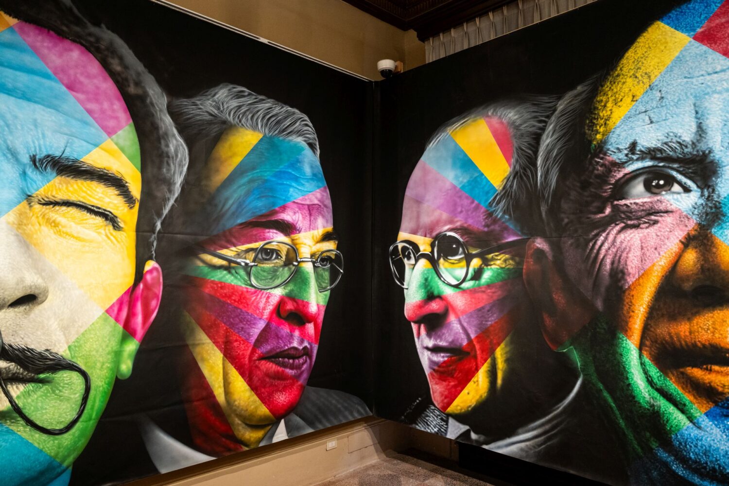 In dialogo con la mostra “Le Avanguardie”, in corso dal 28 settembre 2023 al 7 aprile 2024, Palazzo Blu ospita due mostre nell’ambito del Festival della Strada: il brasiliano Eduardo Kobra, uno degli street artist più noti al mondo (suo il David di Michelangelo dipinto in cima alle cave di Carrara), crea nella Sala della Biblioteca una contemporanea Scuola di Atene, attingendo dai ritratti degli Avanguardisti; 108, Moneyless, Etnik, Zed1, Aris, Gio Pistone, Massimo Sospetto rileggono lo stile Bauhaus attraverso una collettiva di arte applicata, nella Dimora nobiliare del palazzo. Nato a San Paolo nel 1976, Eduardo Kobra è un gigante dei murales e l’alfiere della neoavanguardia paulista: combinazioni di tecniche diverse come la pittura coi pennelli, l’aerografo e gli spray, rendono le sue opere maestose e fuori da ogni schema. Il suo talento emerge tra i dedali della città alla fine degli anni ’80: da allora Kobra ha creato murales in ogni continente, compreso il più grande al mondo (oltre 3000 mq di superficie), realizzato per le Olimpiadi di Rio de Janeiro. Il clima vagamente nostalgico delle sue opere unito al suo distintivo arcobaleno cromatico, crea un cortocircuito visivo che trascina lo spettatore in una narrazione romantica e divertente. La Chiesa della Spina diventa teatro dell’installazione “Non Plus Ultra”, di Gonzalo Borondo, artista spagnolo classe 1989 che dal 2007 interviene nello spazio pubblico sviluppando un linguaggio originale, in connessione con il luogo d’azione e la percezione fisica e simbolica degli spazi. L’installazione pisana si ricollega alla spiritualità della Chiesa della Spina, innescando una riflessione esistenzialista più che religiosa. Trentacinque lastre di vetro stampate ciascuna delle quali ospita due immagini grafico pittoriche: una colonna e una figura di spalle con le braccia distese, che rimanda all’iconografia della crocifissione.