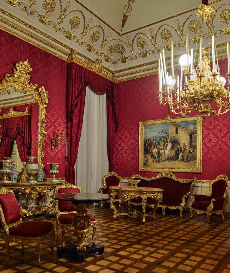 - La Sala del Trono, caratterizzata da un imponente lampadario e pareti in rosso porpora, emblema del potere regale.