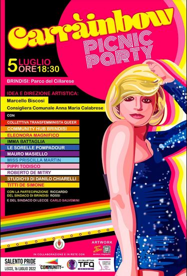 Vi aspettiamo dunque a Brindisi dalle 18.30, nel grande Parco del Cillarese per un evento davvero speciale che darà il via al Salento Pride che da Brindisi, quest’anno passa il testimone alla città di Lecce il 16 luglio. Per l’occasione prima dello show omaggio alla Carrà con performer e artisti devoti al caschetto biondo più iconico, introdurremo con una discussione aperta e libera, sui diritti civili e contro l’intolleranza ancora tangibile purtroppo su più fronti. Appuntamento a domani dunque, per CARRÀINBOW un pic-nic party unico e coloratissimo“.