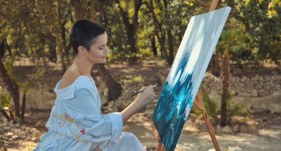 In Puglia, all’interno del Parco Naturale Regionale “Porto Selvaggio e Palude del Capitano” città di Nardò, vicino Lecce. Con la roduzione Monkey Studio per Studio Carriero e Partners e la regia di Angelo Cascione, che ha lavorato con Pasco e Sud Sound System. Mi si vede dipingere ma l’autrice della tela è la talentuosa Chiara De Lorenzo mentre per gli abiti ho collaborato con l’Accademia Sitam Lecce e quello che indosso è di Idea Sposa.