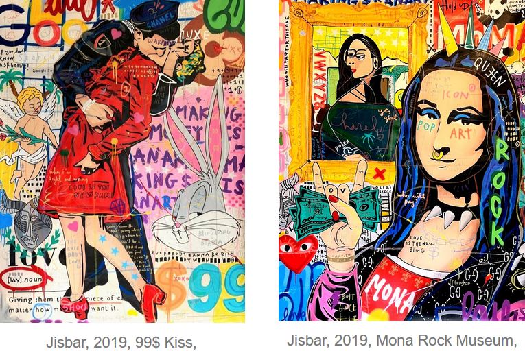 Jisbar è un artista, nato nel 1989 che ha fatto circolare la sua arte in giro per Parigi per 10 anni. La sua arte si occupa del fronte dei riferimenti alla cultura pop. Le sue creazioni aggiornano la nostra società satura con riferimenti mediatici e pop, che prende e interpreta con il suo universo. Moda, musica, skateboard, una mente da freestyle e altre espressioni trovate nelle strade sono gli elementi che costruiscono il suo stile. A Jisbar piace dire che ognuna delle sue opere rappresenta «momenti della vita», come un ricordo che viene fatto per sempre in un album fotografico. Questa nostalgia di un tempo passato e l’innocenza della sua infanzia sono congelate nei suoi dipinti, in cui il potere dei colori gioca un ruolo fondamentale.