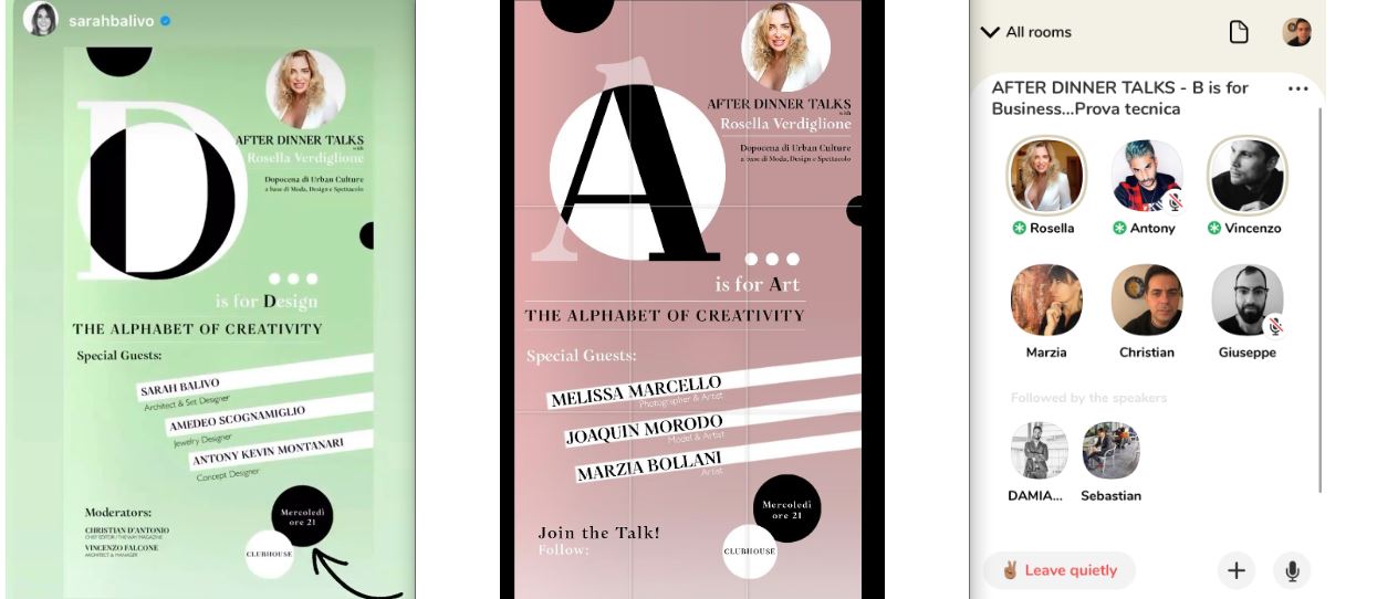 A come arte, B come business, C come cinema, D come design…Ogni settimana su Clubhouse un gruppo di creativi, tra cui anche Christian D’Antonio di The Way Magazine, si riunisce per discutere con ospiti d’onore nei loro rispettivi campi, dei nuovi orizzonti della creatività. Ogni mercoledì sera una discussione diversa in base alla lettera e all’argomento trattato. Con il concept designer Antony Kevin Montanari e l’architetto Vincenzo Falcone che hanno avuto l’idea con la host Rosella Verdiglione, head of casting di moda molto conosciuta a Milano, The Way Magazine accoglie ospiti e personaggi di rilievo nella room “AFTER DINNER TALKS” denominata un “Dopocena di Urban Culture
