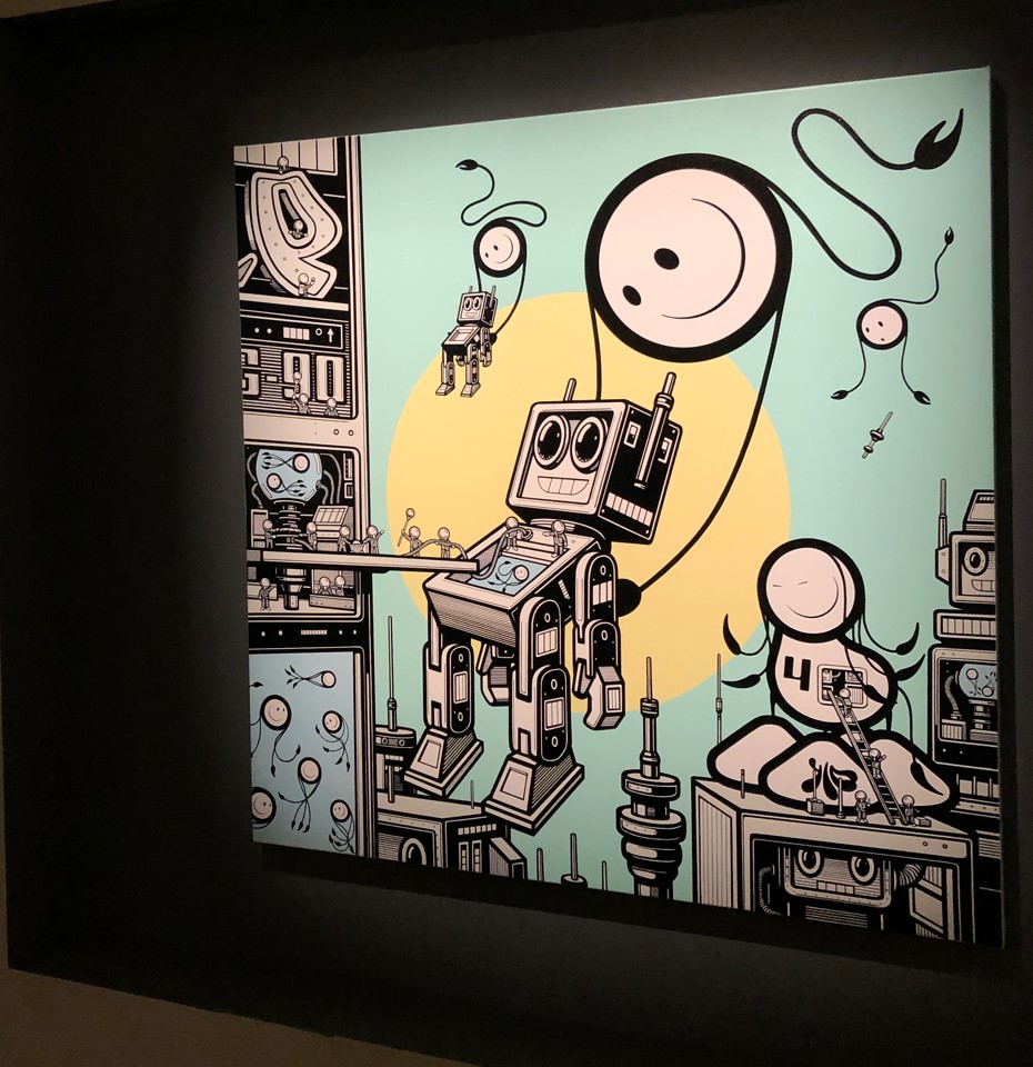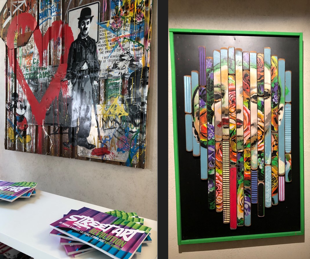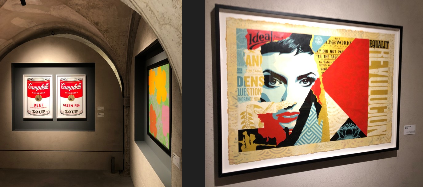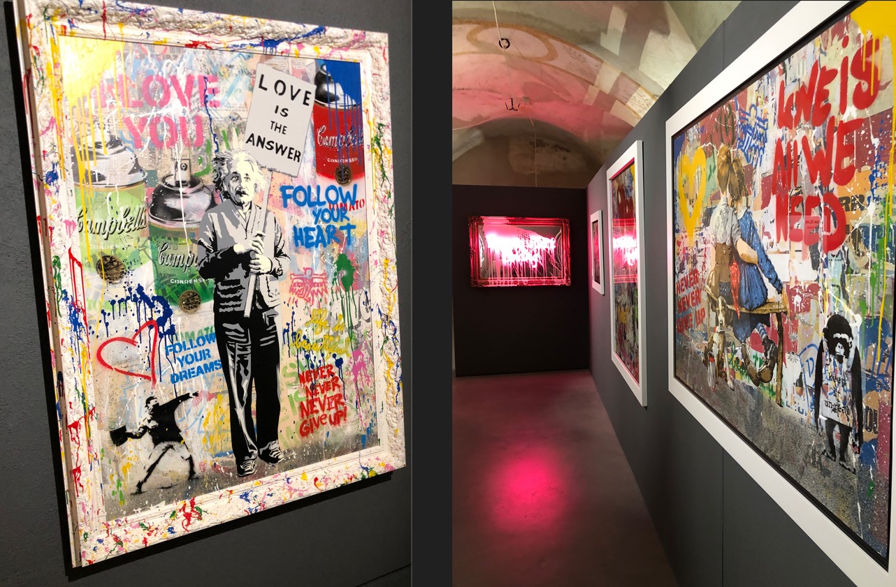 In foto in alto, la sezione della mostra dedicata a Mr Brainwash, al secolo Thierry Guetta. Era uno dei protagonisti di “Exit Through the Giftshop”, mitico documentario della corte di Banksy nel 2010. Oggi è un punto di riferimento per l’arte urbana nel mondo.