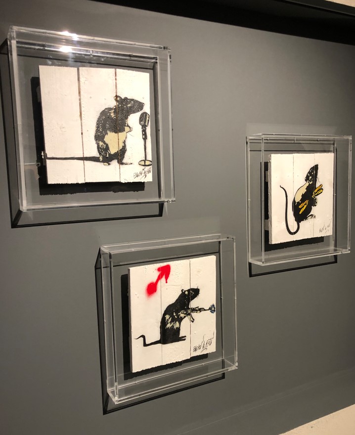 La sezione successiva è sempre ambientata nella Grande Mela dei primi anni Ottanta con JonOne, uno dei primi e principali esponenti della graffiti art, che ha il grande merito di aver portato i graffiti da Harlem (NY) a Parigi e dalla strada alla tela. Passando per JonOne si arriva dunque alla scena europea, dove Blek le Rat e poco dopo Jef Aérosol hanno cambiato il volto delle città francesi con i loro innovativi stencil. Considerato padre della Stencil Art, Blek le Rat con il suo famoso “ratto”, simbolo della ribellione e della pervasività dell’arte urbana, ha influenzato generazioni di artisti fra cui Banksy. Il celebre artista britannico con le sue opere provocatorie e socialmente consapevoli, ha portato la stencil art dall’Europa all’attenzione globale. Le sue creazioni sono diventate iconiche, definendo la Street Art come una potente forma di espressione politica e sociale.