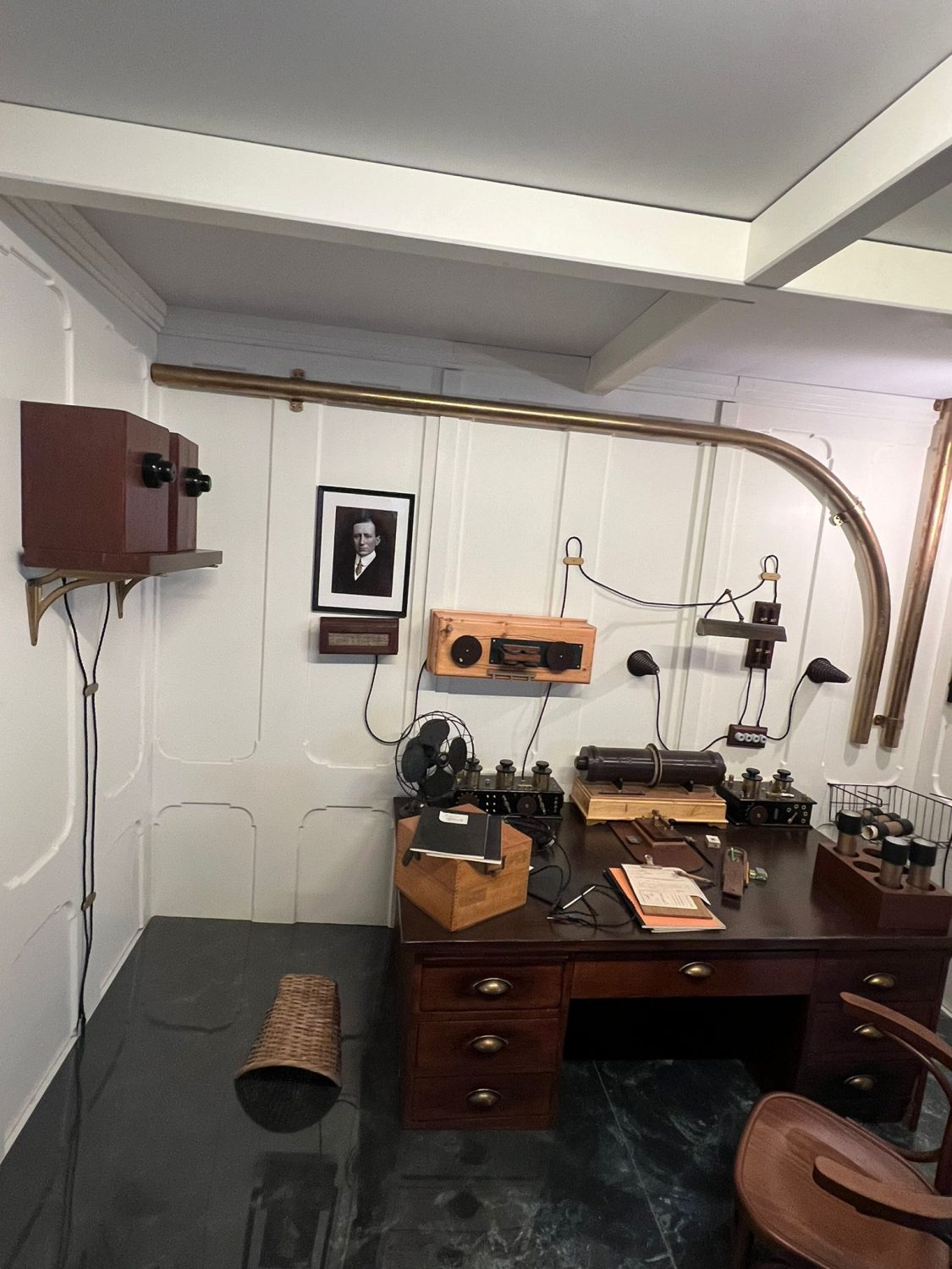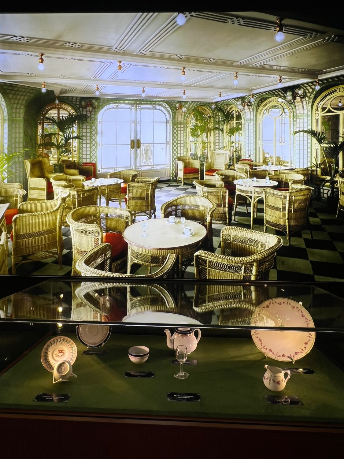 E poi oggettistica dell’equipaggio (dal cappello del capitano a uniformie accessori dei marinai) fino a splendidi elementi del noto Scalone centrale, come uno degli angeli decorativi ispirati alla reggia di Versailles.