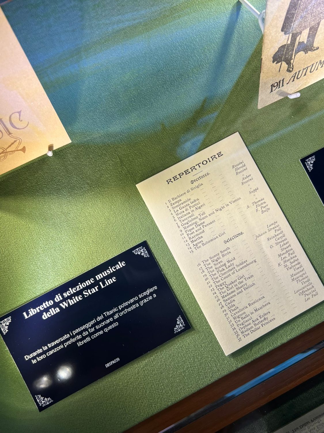 Fra gli stupefacenti reperti in mostra si ammirano documenti della costruzione del Titanic, ma anche i biglietti d’imbarco della White Star Line, sua società di navigazione: oggi, per un posto in prima classe, si sarebbero spesi circa 60mila euro.
