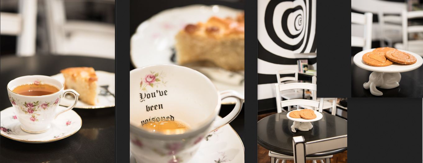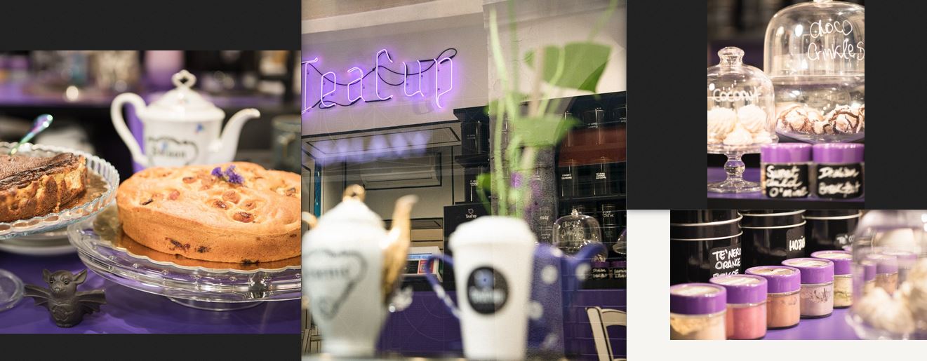 Questo posto è una “sala da tè”: con le sue pareti bianche e nereche creano curiosi effetti optical, e le insegne al neon viola che contrastano con il soffitto a cassettoni cinquecentesco, Teacup si rivela subito come un mondo parallelo, ispirato alla fiaba di Alice nel Paese delle Meraviglie, alle atmosfere del cinema espressionista tedesco, allo stile tra il giocoso e il misterioso di molte pellicole di Tim Burton.