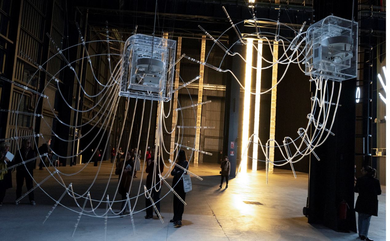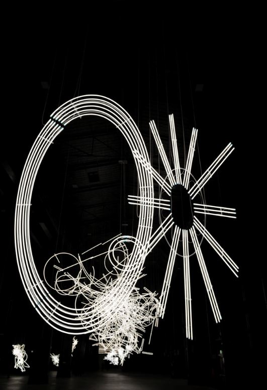 La mostra ” ….the Illuminating Gas”, a cura di Roberta Tenconi e Vicente Todolí, presenta venticinque lavori, tra sculture storiche, complesse installazioni monumentali e nuove produzioni, che occupano in tutto il suo volume gli oltre cinquemila metri quadrati delle Navate e del Cubo di Pirelli HangarBicocca. Il percorso si apre con il lento e costante pulsare di sette imponenti colonne luminose alte venti metri StarStarStar/Steer (totransversephoton) (2019). L’opera, realizzata appositamente per la mostra e composta da uno scheletro di lampade tubolari assemblate in cilindri di varie altezze, crea una coreografia di luci e ombre che a intermittenza invadono lo spazio. Tale dispiego di energia fa da contrappunto al suono emesso dall’opera attigua, eterea scultura in vetro anch’essa composta di elementi trasparenti, Composition for 37 flutes (2018). Dalle sue sottili canne l’aria scaturisce in un sibilo che suggerisce uno stato di tensione tra l’armonia di un respiro e il suo dissolversi.
