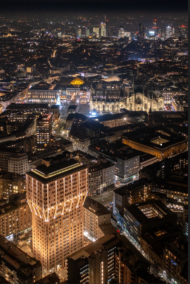 L’iniziativa natalizia, anteprima straordinaria del progetto statico permanente di lighting, ha come obiettivo l’esaltazione della forma e della materia nel rispetto dell’opera e del suo valore storico. La creazione dell’equilibrio visivo è ottenuta attraverso un chiarore delicato, che mette in evidenza l’intero corpo dell’edificio, una luce uniforme che sottolinea l’aggetto al diciottesimo piano, e, infine, un’illuminazione di dettaglio volta a enfatizzare i costoloni verticali, che slanciano lo sguardo verso l’alto, dove l’illuminazione culmina sulla copertura in rame.