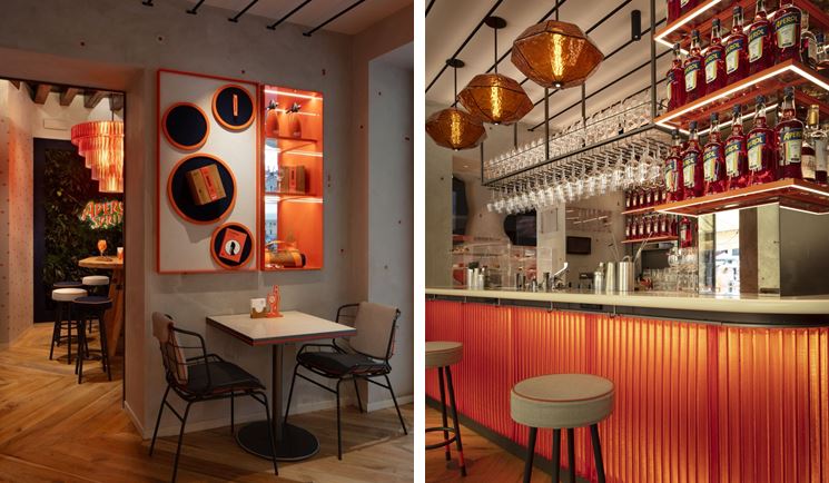 Caratterizzato dai toni inconfondibili dell’arancione dell’Aperol Spritz, Terrazza Aperol si trova nel cuore di Venezia, a due passi dal Ponte dell’Accademia, in Campo Santo Stefano. Lo studio di architettura milanese Vudafieri-Saverino Partners, con sede anche a Shanghai, dopo aver dato vita al progetto d’interior nel 2021, rivisita il concept di questo spazio di 70 mq, capace di connettere la suggestione dei bacari, le piccole osterie tipiche di Venezia, con l’allure contemporaneo di un cocktail bar. Per offrire un’esperienza ancora più autentica e profonda dell’aperitivo arancione conosciuto in tutto il mondo, gli architetti Tiziano Vudafieri e Claudio Saverino arricchiscono gli spazi principali del Bacaro e del Bar enfatizzando il forte legame tra Aperol e la tradizione veneziana – e danno forma alla Social Room, un ambiente capace di esaltare il piacere della convivialità e dello stare insieme. In tutti gli spazi gli architetti hanno introdotto accenti di colore blu, presente nella brand identity di Aperol, per dare un’ulteriore nota di personalità abbinata alle tonalità neutre e ai dettagli del tipico arancione che caratterizzano il progetto.
