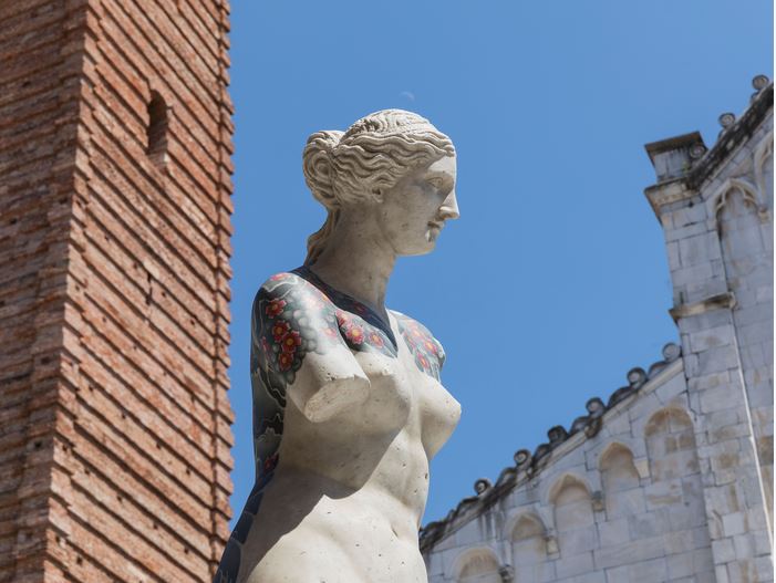 In occasione della mostra, Fabio Viale, legato fin da giovane alla Versilia per la selezione e la lavorazione del marmo, ha previsto l’allestimento nella piazza del Duomo di alcuni marmi tatuati, di grande dimensione. I segni realizzati sul marmo sono una combinazione personale delle più attuali tendenze del tatuaggio, da quelli già sperimentati del mondo criminale e giapponese, ai nuovi orientamenti provenienti dal mondo sudamericano e dei Trapper. Confermando l’attitudine dell’artista a decodificare la sensibilità dei nostri giorni, Viale compone un inedito linguaggio trasversale, che attinge a una sorta di universo segnico Old Style. Tra questi lavori spiccano Souvenir David – un magistrale volto cavo, una sorta di maschera monumentale del David di Michelangelo, su cui l’artista ha sperimentato per la prima volta questo nuovo tipo di tatuaggio – un grande torso ispirato al Torso Belvedere e un’opera inedita: un torso ispirato al Torso Gaddi che vedrà la collaborazione del famoso Direttore Creativo Marcelo Burlon. Sulla superficie marmorea, saranno tatuati i suoi noti motivi, un mix audace di elementi naturali e stilemi contemporanei.