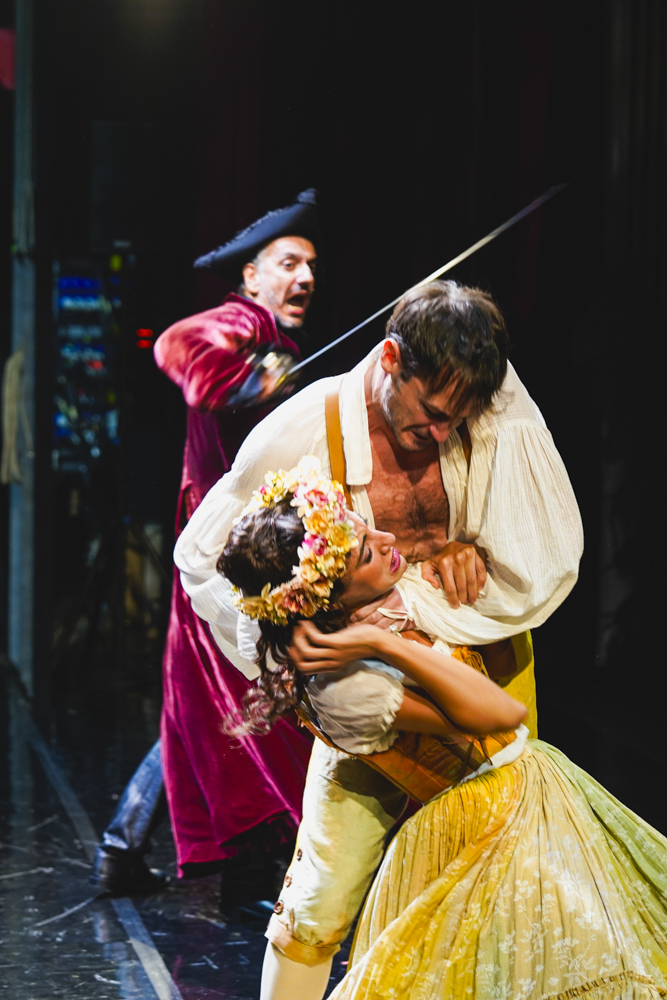 particolare effetto il finale per nulla pirotecnico, come vuole la tradizione, ma più intimo e sofferto, come una confessione del fedifrago ateista a se stesso. Come d’effetto sono le scene di Dario Gessati che rimandano ai giardini di Versailles, i costumi di Gianluca Falaschi (anche qui una commistione tra elementi d’epoca e moderni, poetico e prosaico appunto) e, soprattutto, le musiche di Mario Autore che riscrive per un ensamble da camera alcuni brani della partitura di Mozart che di questa vicenda riesce a raccontare sia la grazia che la tragedia ineluttabile. “Perché – per dirla alla Cirillo – in fondo questa è anche la storia di chi non vuole o non può fare a meno di giocare, recitare, sedurre; senza fine, ogni volta da capo, fino a morirne.”