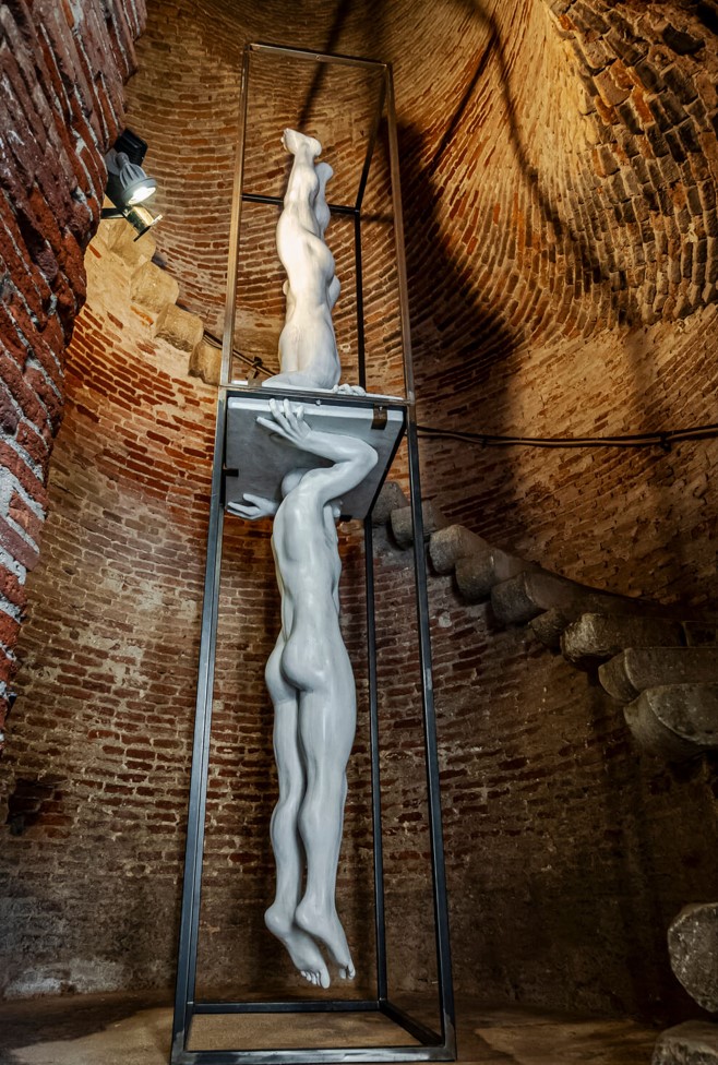 All’interno del campanile del Duomo di Pietrasanta, un capolavoro architettonico caratterizzato da una scala elicoidale in mattoni dalla particolare torsione ascendente che vede avvolgersi su sé stessa e intorno al vuoto centrale la scalinata, è installata l’opera Gravity dell’altezza di 4 metri. In questo spazio, dove la gravità è l’elemento costruttivo sorprendente, trova spazio l’opera di Giannelli, un telamone che sorregge la sua stessa figura capovolta e che della gravità coglie diverse accezioni: regge con forza il suo doppio sovrastante ma con un’espressione di solenne e austera compostezza.