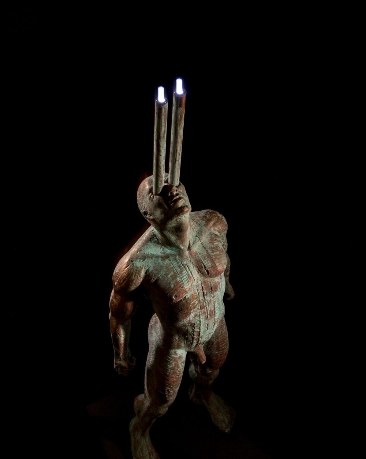 Mr. Arbitrium facing Mr. Arbitrium, ovvero Mr. Arbitrium Mirrored, è il doppio della più colossale e universalmente nota scultura di Emanuele Giannelli che qui, nel suo specchiarsi, ricorda i gesti e i movimenti degli atleti dell’antica Grecia, il cui corpo a corpo disegnava immagini di bellezza e perfezione. In quest’opera, anch’essa come Gravity frutto di uno sdoppiamento, emergono gli ideali di armonia e proporzione della plastica attica, canoni di bellezza a cui Giannelli ricorre in talune sue creazioni, solo che in questa millenaria lezione di estetica ideale Giannelli introduce l’uomo contemporaneo, che con lo sguardo nascosto negli occhiali da saldatore è immerso in quella “visionarietà” che è uno dei temi portanti della poetica e dell’estetica di Giannelli.