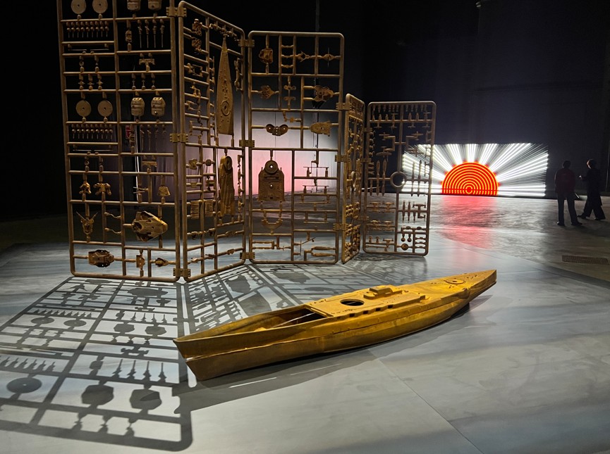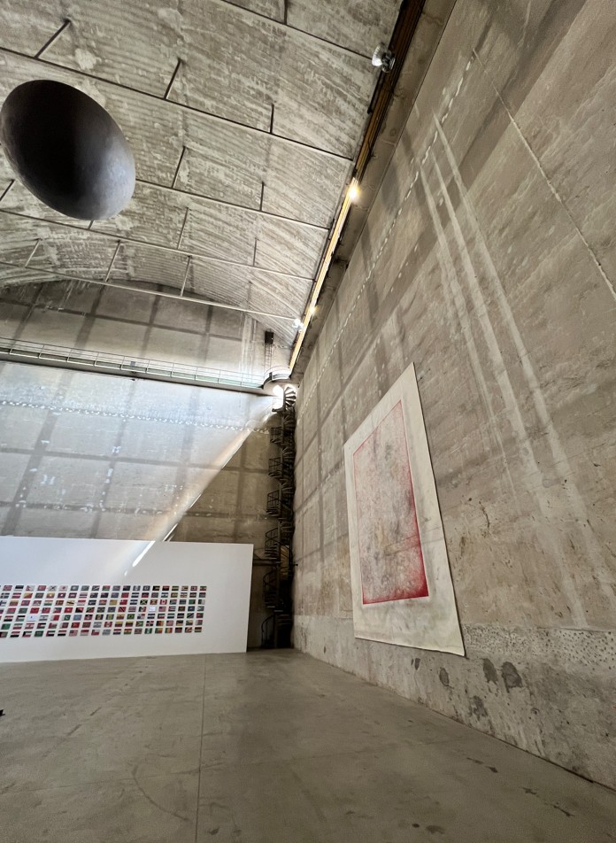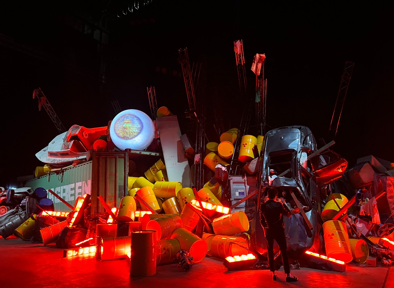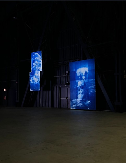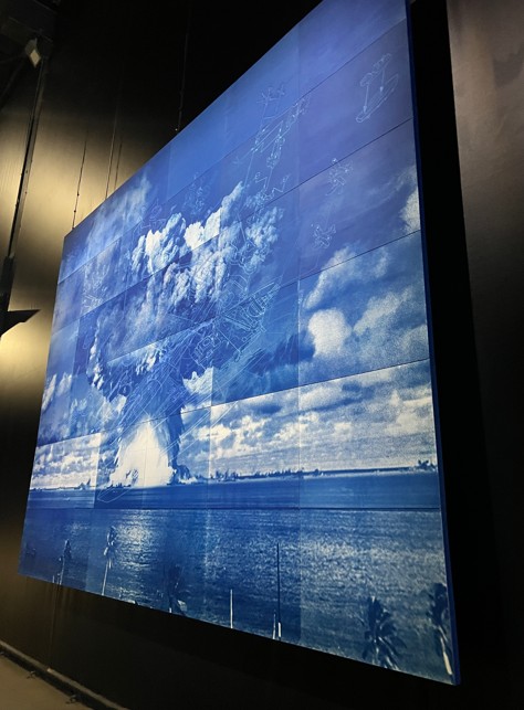 La mostra si apre con l’opera Project God-zilla 2025 – The Revenant from “ El Mare Pacificum” (2025). Al centro di un accumulo di detriti e oggetti di scarto, pezzi di acciaio, di legno, componenti di macchine e sacchi di sabbia, viene proiettato il grande occhio di Godzilla, mostro creato e potenziato dall’energia nucleare. Richiamando il personaggio pop del cinema giapponese, l’opera fa riferimento all’impatto ambientale causato dall’utilizzo di armi nucleari creando uno scenario post-apocalittico, che evoca un senso di distruzione di massa e sottolinea la vulnerabilità della natura e dell’uomo. L’opera monumentale sarà in dialogo con Article 9 (1994), composta da diverse strutture neon disperse nell’ambiente espositivo che si accendono e spengono a intermittenza. I visitatori sono invitati a mettere insieme parole, frasi e frammenti in giapponese dal colore rosso luminoso che, quando riposti nell’ordine corretto, recitano il testo dell’articolo 9 della costituzione giapponese. Nella clausola, aspirando a una pace internazionale, viene fatta rinuncia per sempre alla guerra e all’uso della forza per risolvere le controversie con altre nazioni.