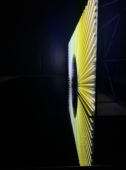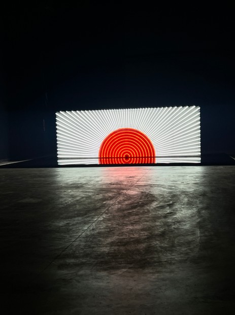 Il percorso espositivo continua con Hinomaru Illumination 2025 (2025), un’installazione neon della bandiera giapponese che si riflette in uno specchio d’acqua. Il simbolo dell’hinomaru, letteralmente “cerchio del sole”, si disperde nel liquido. In questo modo, l’artista inserisce, ancora una volta, una componente dinamica e mutevole per contestare la stabilità del simbolo stesso.