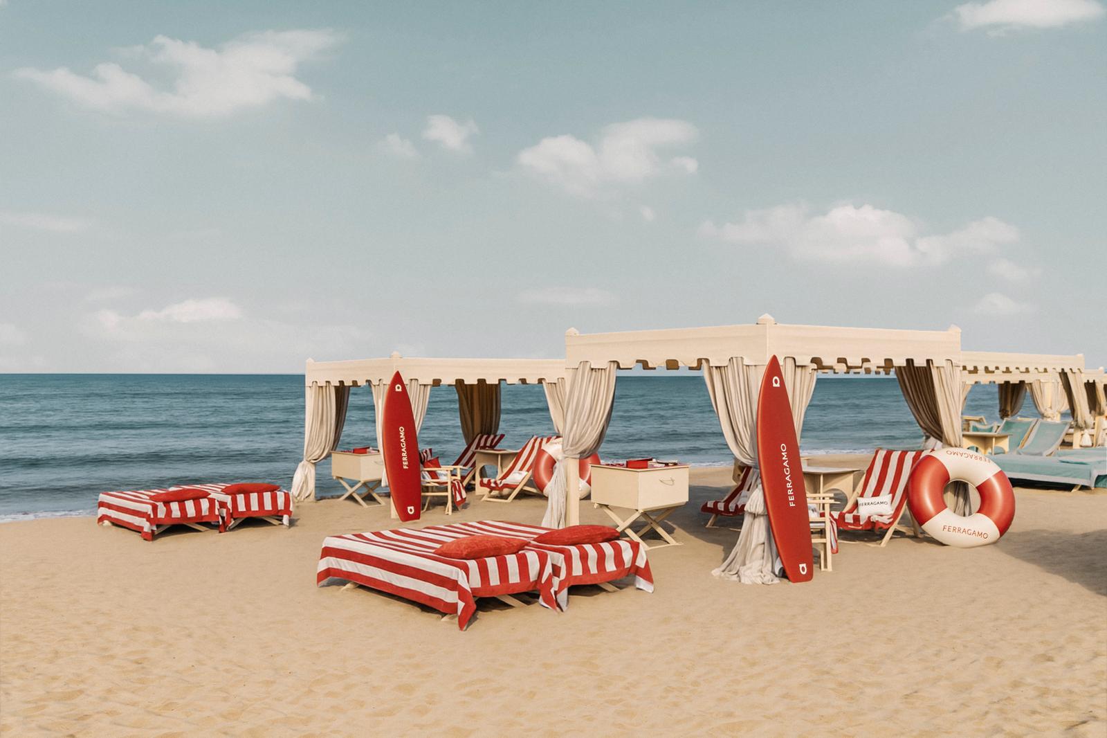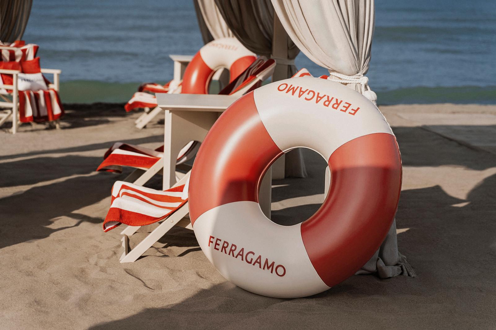 È così che il brand rilancia lo storico stabilimento Apemare, simbolo di raffinatezza balneare, personalizzando cabane e lettini con splendidi teli mare e cuscini in morbida spugna a righe rosse e bianche, impreziositi dal logo Ferragamo.