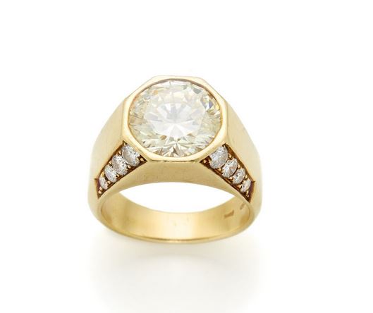 coppia di orecchini in platino e oro bianco con diamanti a goccia e navette per complessivi 18 ct circa. La tornata dedicata ai gioielli prosegue con due bracciali di cui uno in platino con 15,50 ct di diamanti, rotondi e navette, e zaffiri ovali no-heat del peso complessivo di circa 15 ct. ed uno a motivo floreale in oro bianco con rubini birmani a taglio ovale per un totale di 24,50 ct. e diamanti rotondi per complessivi 9,80 ct. Chiude la sessione, un anello in oro giallo con incastonato un diamante, taglio a brillante, di circa 4,90 ct adornato da due file di diamanti.