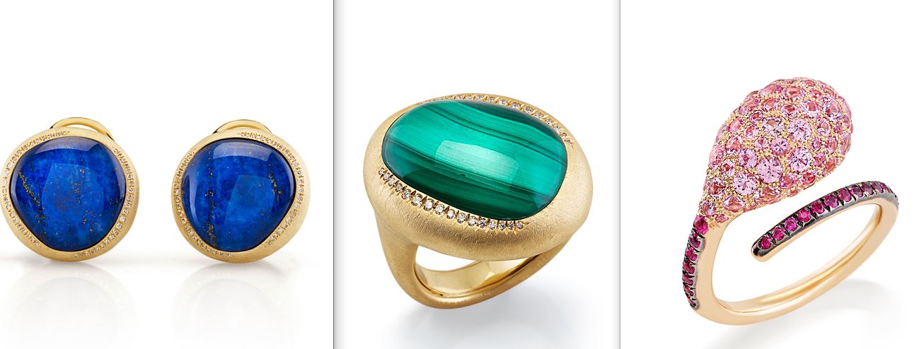 Enchanté. Forme fluide e arrotondate caratterizzano le tre nuove parure presentate a VicenzaOro. Segni archetipi e dinamiche senza tempo, evocazione, simbolo e astrazione. Pietre traslucide, lapislazzuli, malachite e moonstone con una vibrazione di luce interna e misteriosa, sono incastonate in oro giallo e rosa satinato e sabbiato. L’incassatura e la struttura dell’anello e degli orecchini seguono e assecondano la pietra senza stacchi o spigoli di sorta.