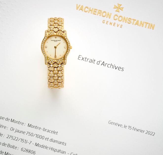 Seguono due Patek Philippe: un Ellipse ref:3598, raro in questa forma più ovale della cassa in oro giallo18 ct. con cinturino in coccodrillo e fibbia originale ad ardiglione in oro, con movimento ultra plat 16250, il più sottile mai realizzato dalla maison svizzera corredato di astuccio originale; un Golden Ellipse ref 3585 dalla forma più quadrata, con cassa in oro giallo 18Kt. Sempre a marchio Patek Philippe, un Gondolo ref 5009, come i precedenti in perfette condizioni, con scatola e garanzia, cassa in oro giallo, cinturino in coccodrillo e fibbia ad ardiglione originale. La selezione di orologi prosegue anche con un raro Vacheron Constantin Malte Hispahan collection in oro giallo 18 ct. con un bracciale full diamond, corredato di scatola originale edestratto d’archivio.