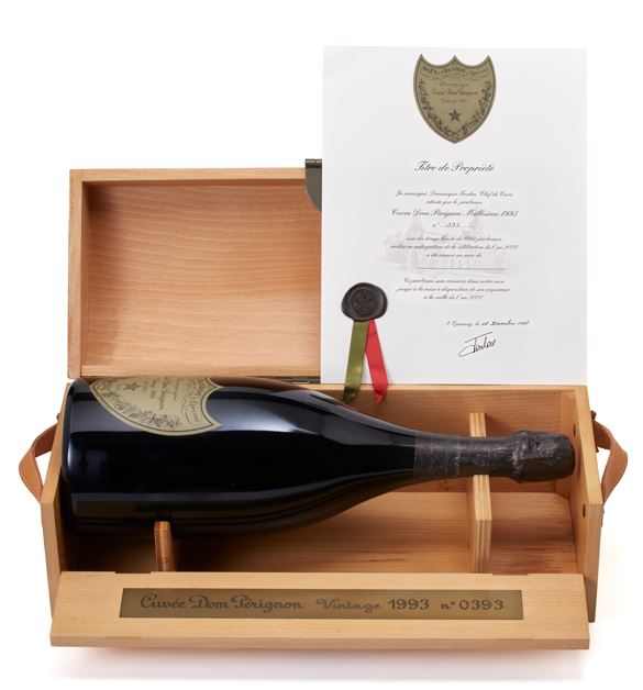 Lotto di chiusura dell’asta, nella tornata pomeridiana, una Cuvee Dom Perignon Millesime, in misura Jeroboam (3l), numerata 393 e parte di una serie limitata del 1993 realizzata per la celebrazione del nuovo millennio. Uno champagne millesimato nelle cantine di Eperney e consegnato all’attuale proprietario alla vigilia dell’anno 2000, custodita in un cofanetto numerato, realizzato in legno pregiato e protetta da un panno in preziosa pelle, corredato di attestato di proprietà.